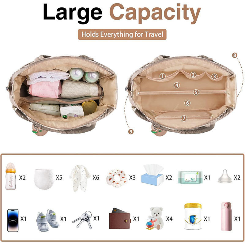 This stylish quilted nylon tote bag combines fashion, functionality, and versatility. It is designed to serve as a spacious diaper or nappy bag, a travel companion, or an everyday tote, offering ample storage and convenient organization for busy lifestyles.
