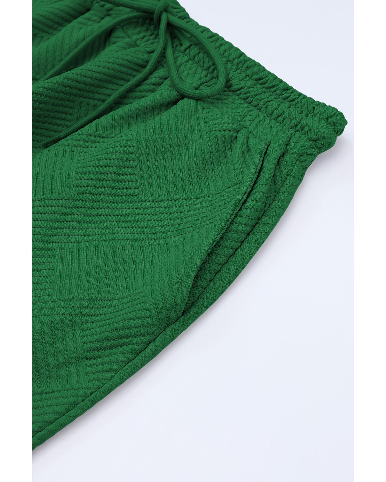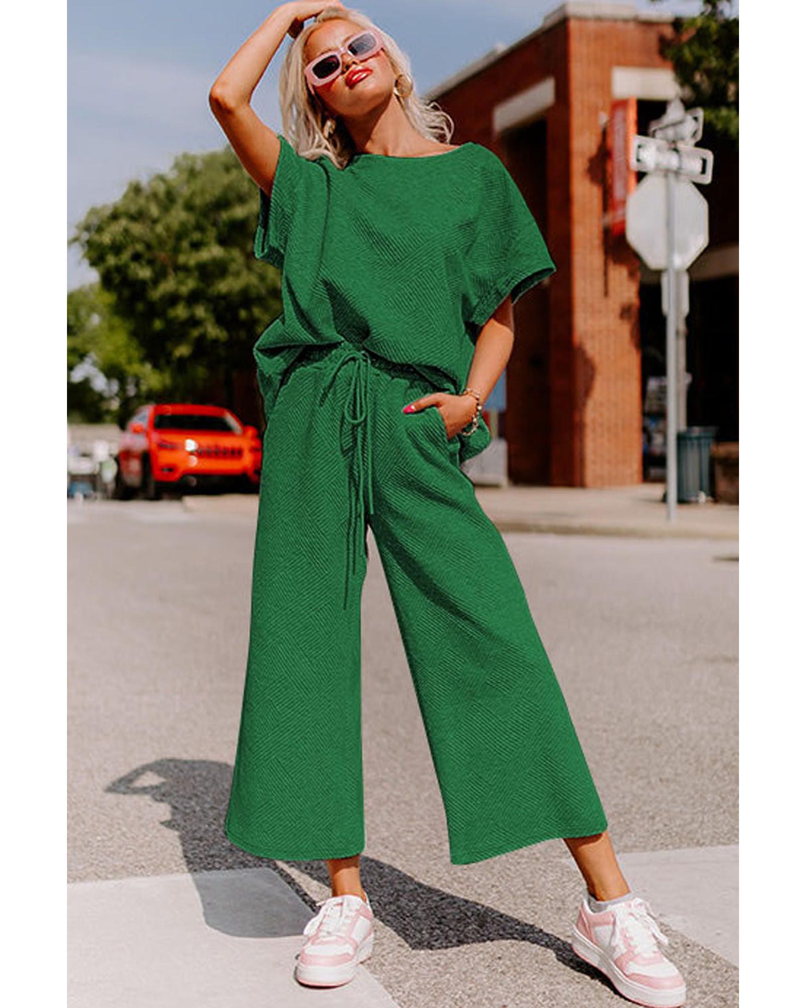 This dark green textured set includes a loose fit T-shirt and drawstring pants, designed for a comfortable and stylish casual look. The textured fabric adds a fashionable touch, making it suitable for lounging or running errands. The set features a drawstring waist for a customizable fit and is available in various sizes to ensure a perfect match.