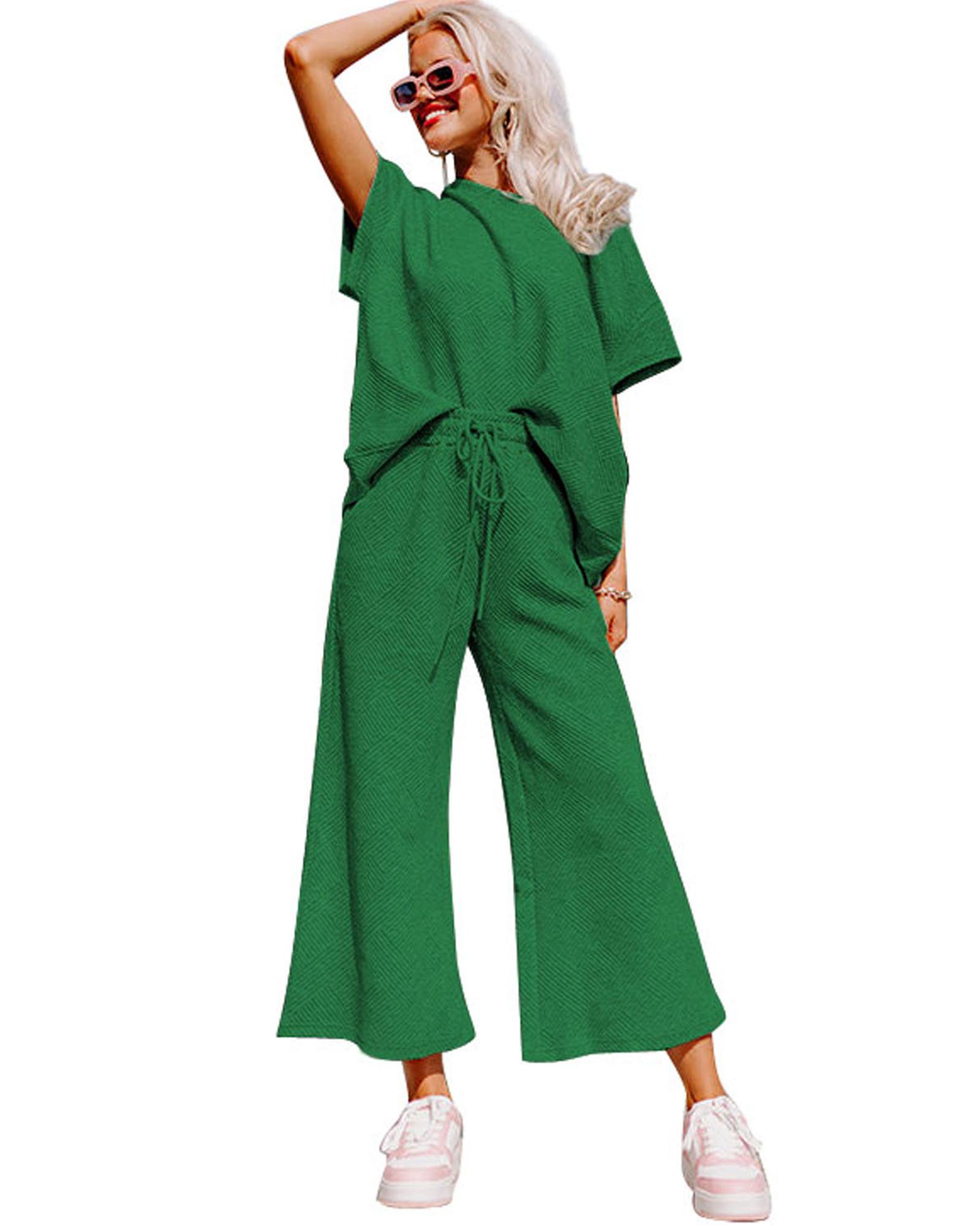 This dark green textured set includes a loose fit T-shirt and drawstring pants, designed for comfort and style. The textured fabric adds a fashionable touch, making it suitable for casual wear, lounging, and running errands. The set features a drawstring waist for a customizable fit and is available in various sizes to ensure a comfortable and trendy look.