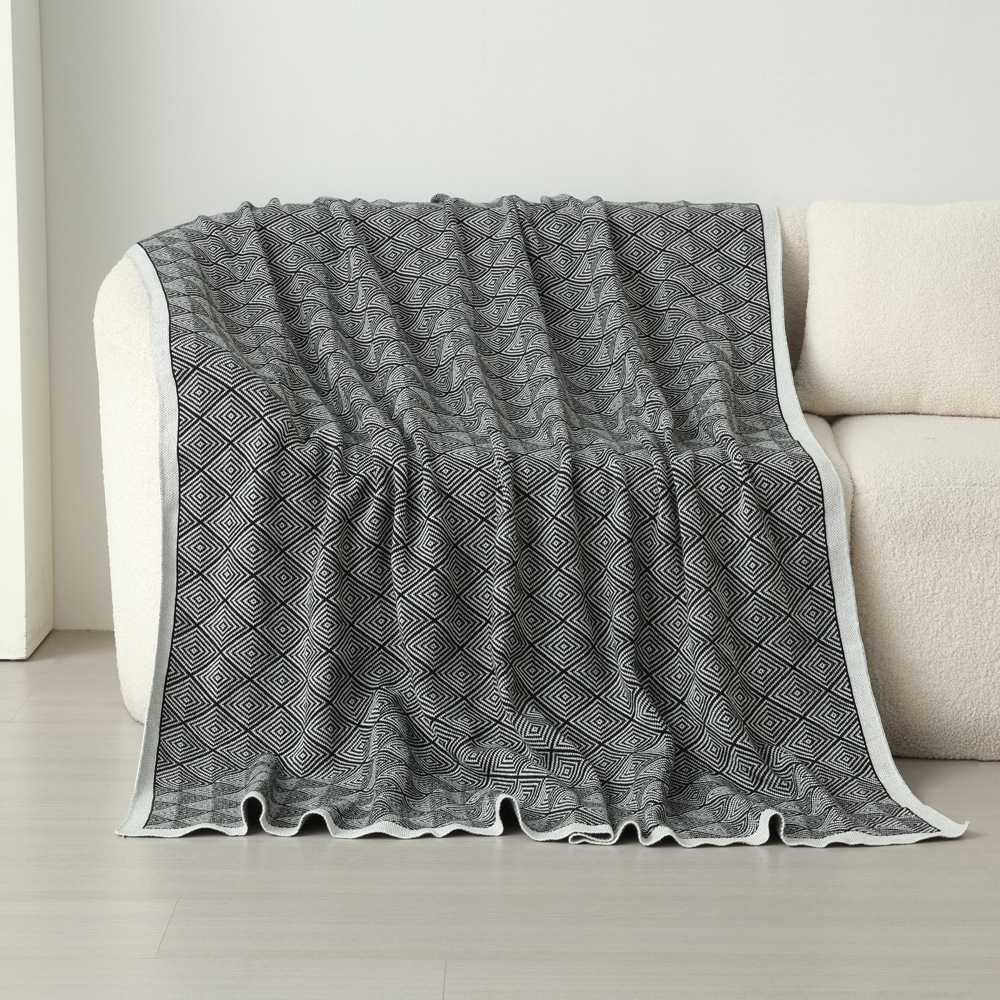 This knitted sofa blanket features a dual-texture design with a soft plush side for added warmth and comfort. Its versatile size and lightweight construction make it suitable for napping, draping over furniture, or use as a casual shawl, providing both style and practicality for home or office environments.