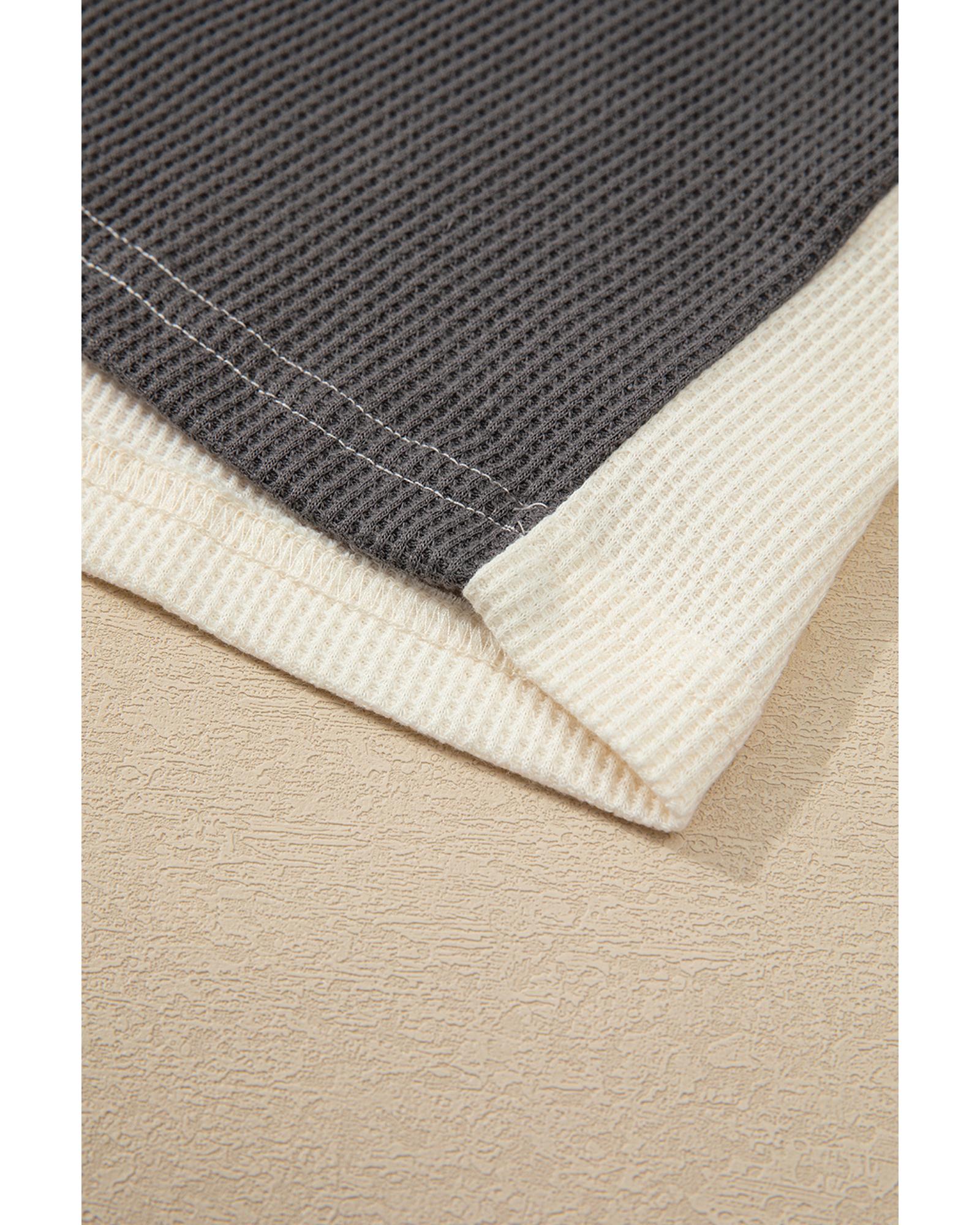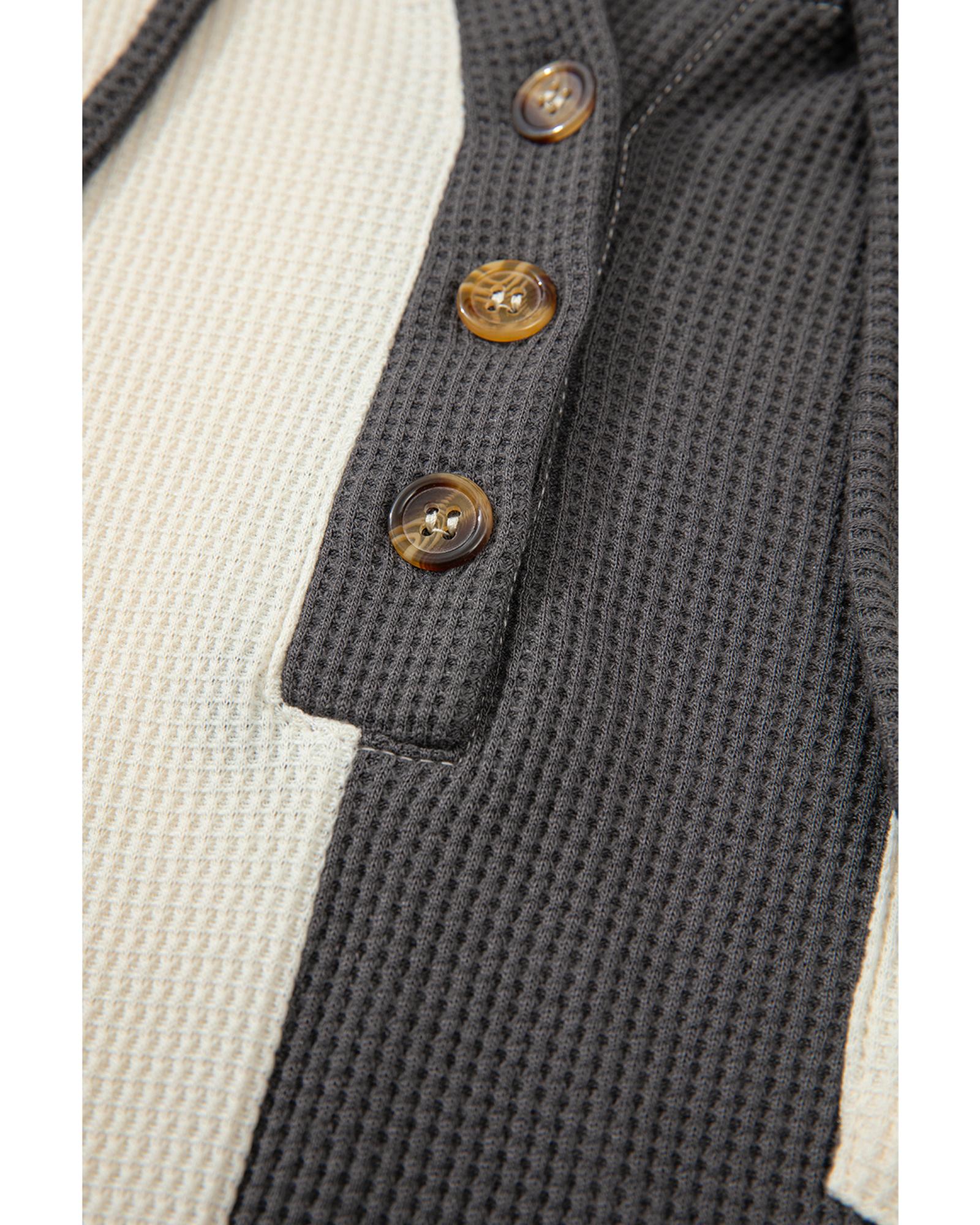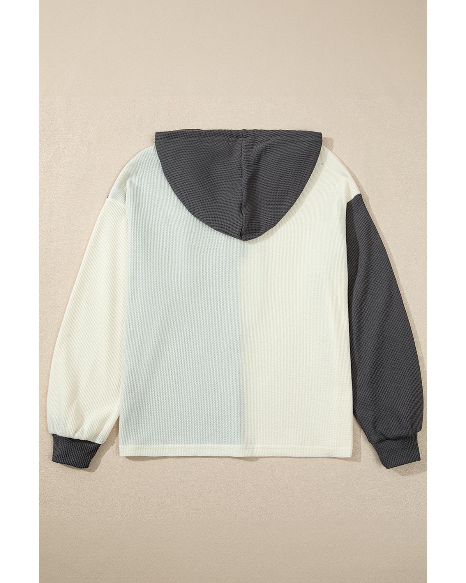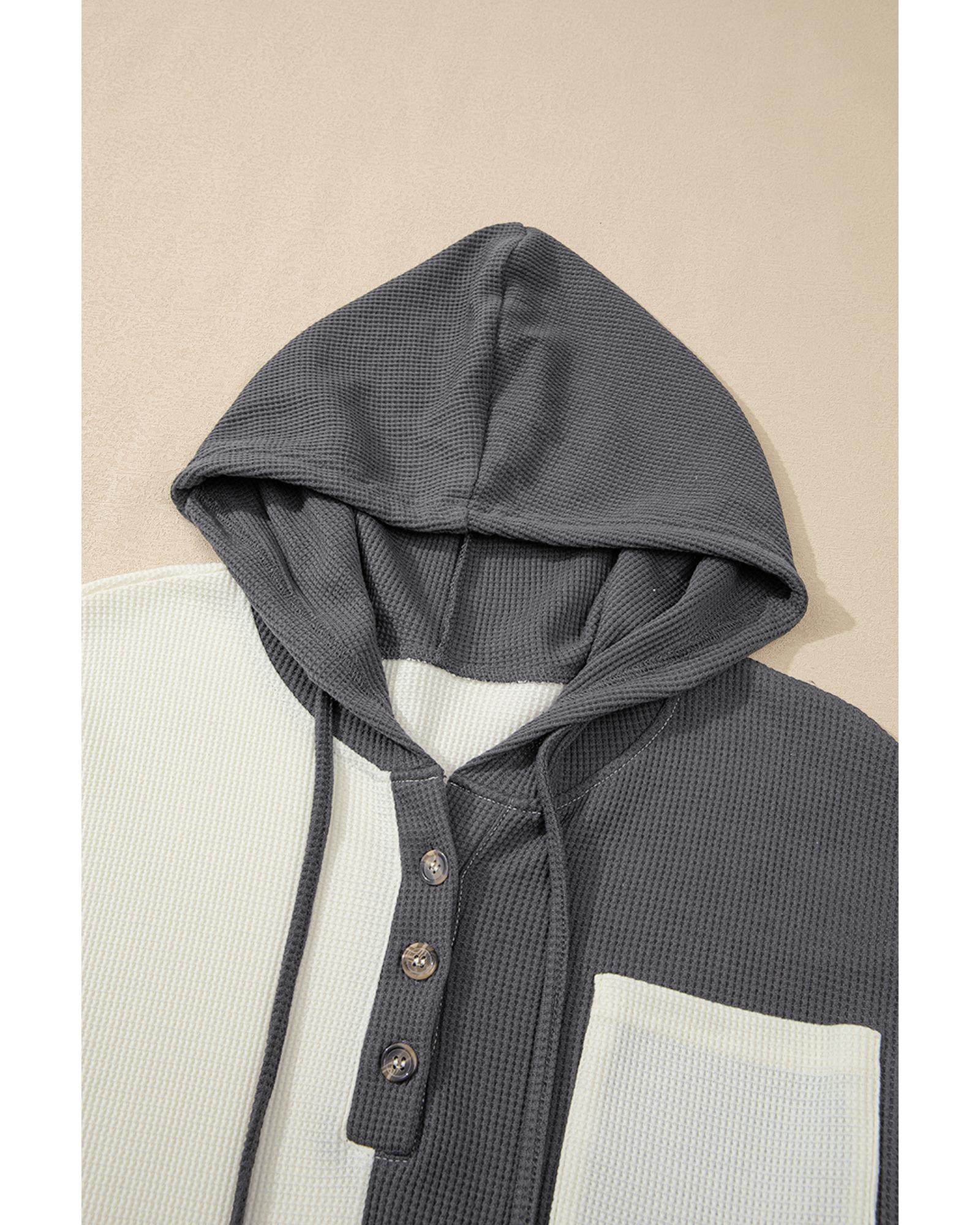 This hoodie features a trendy colorblock design with a textured waffle knit fabric, offering a relaxed and laid-back style suitable for cooler days or outdoor wear. Its drop shoulder and buttoned placket add to its casual aesthetic, making it a versatile addition to your wardrobe.