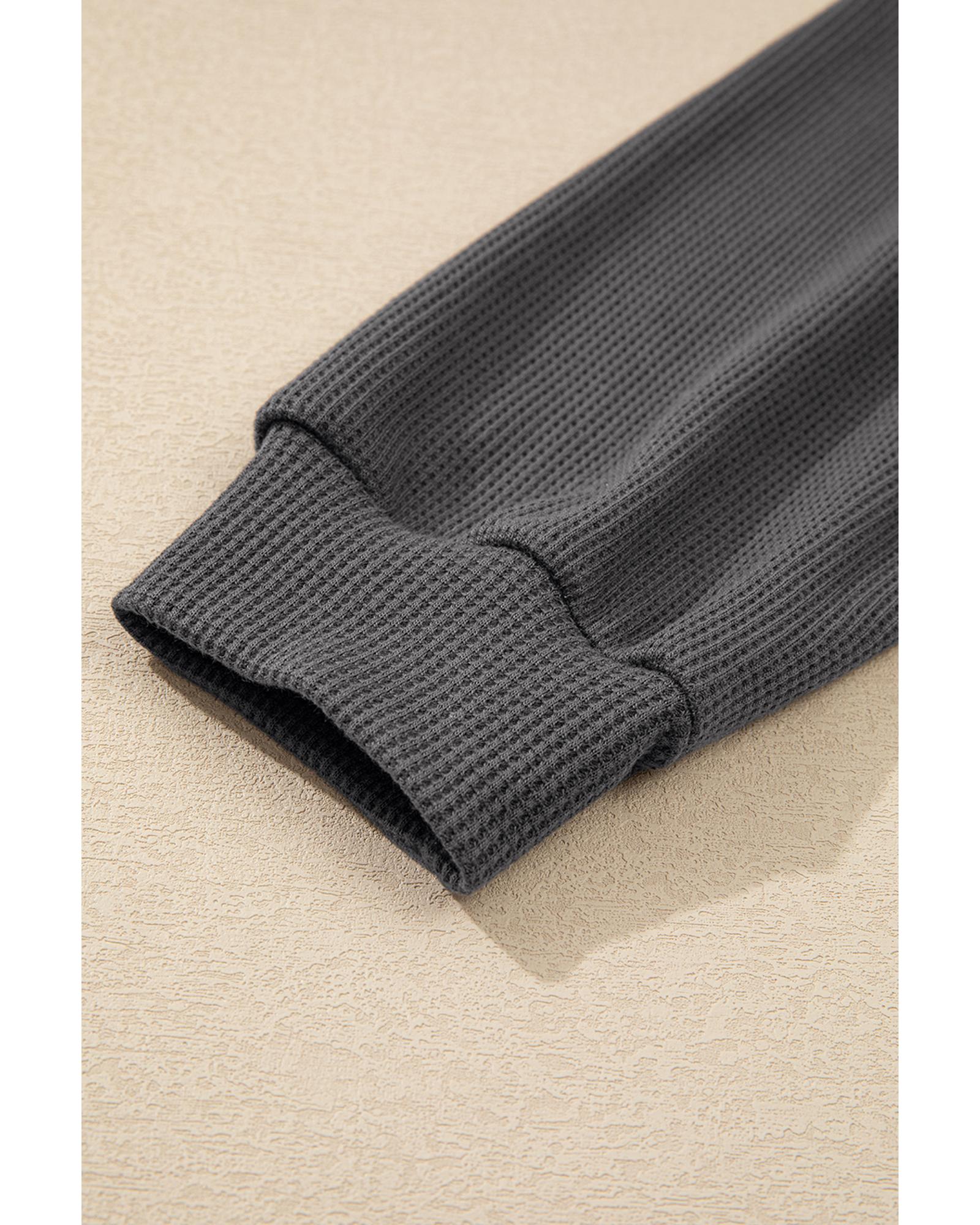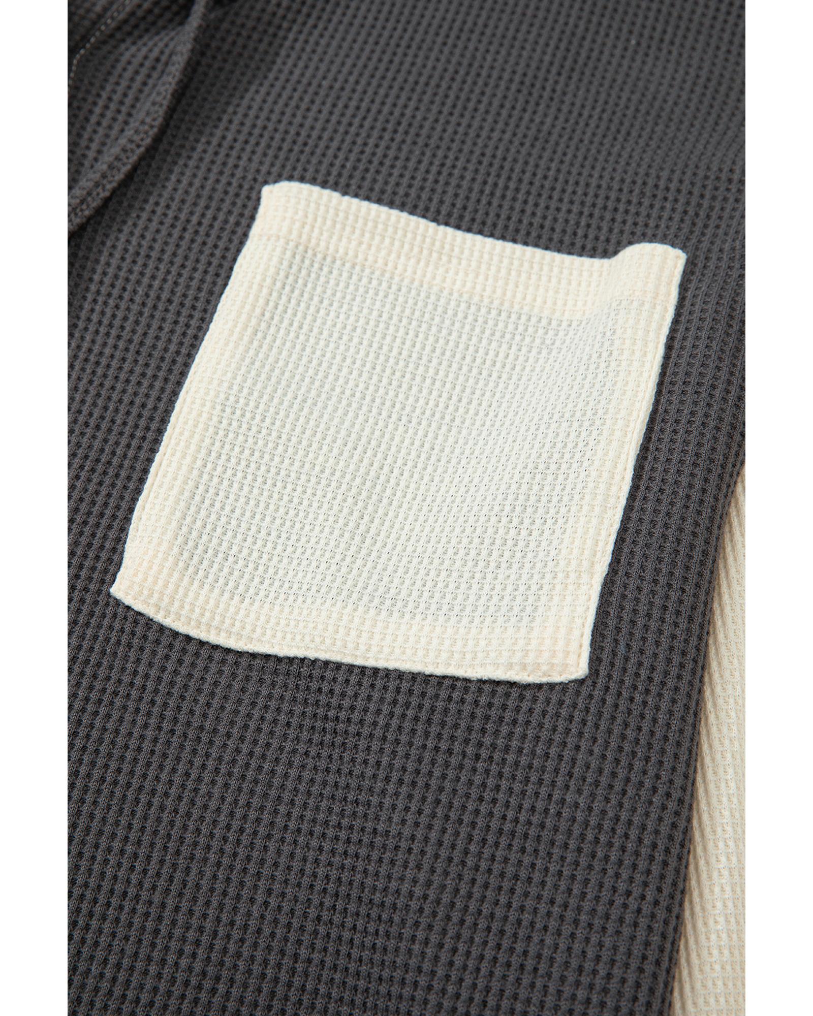 Dark Grey Waffle Colorblock Buttons Placket Drop Shoulder Drawstring Hoodie – M