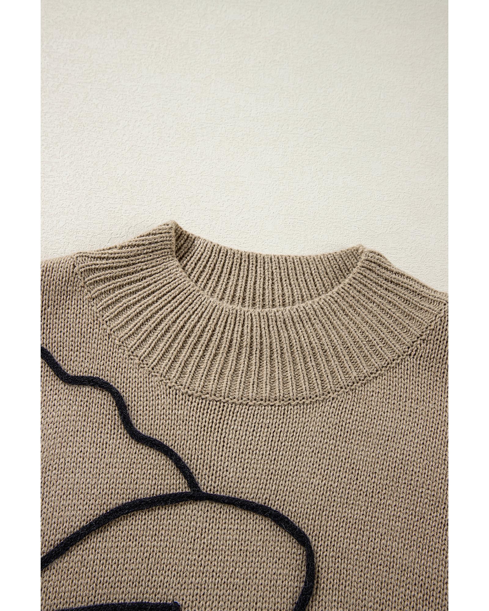 Dark Khaki Plus Size Big Flower Pattern High Neck Drop Shoulder Sweater – 4X
