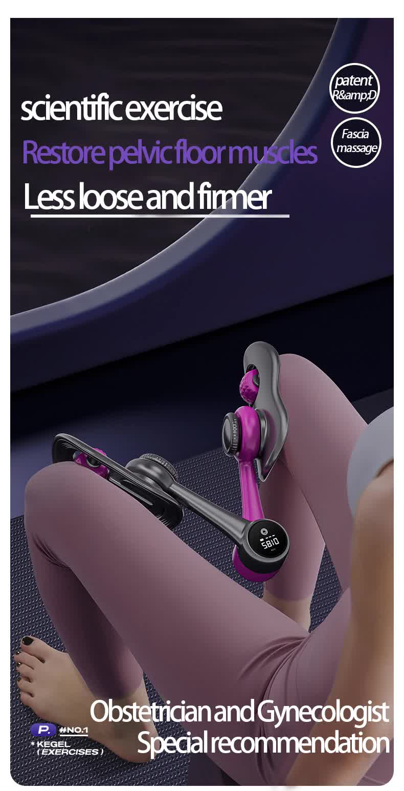 This multifunctional pelvic floor muscle trainer features a sleek dark purple design with an LCD display for real-time exercise tracking. It offers a 360-degree rotatable structure, allowing for versatile workout postures targeting the legs and pelvic area. Made from eco-friendly materials, it combines durability with comfort and safety. Its compact and lightweight design makes it easy to carry and store, and it is rechargeable via a convenient Type-C port for hassle-free use.