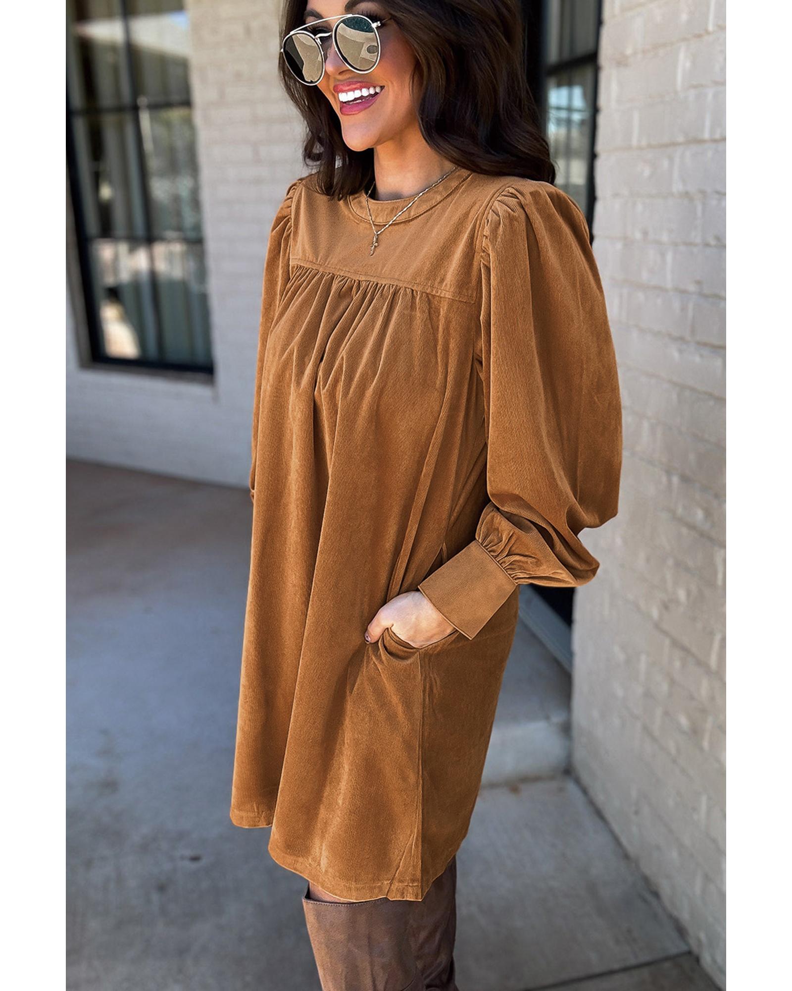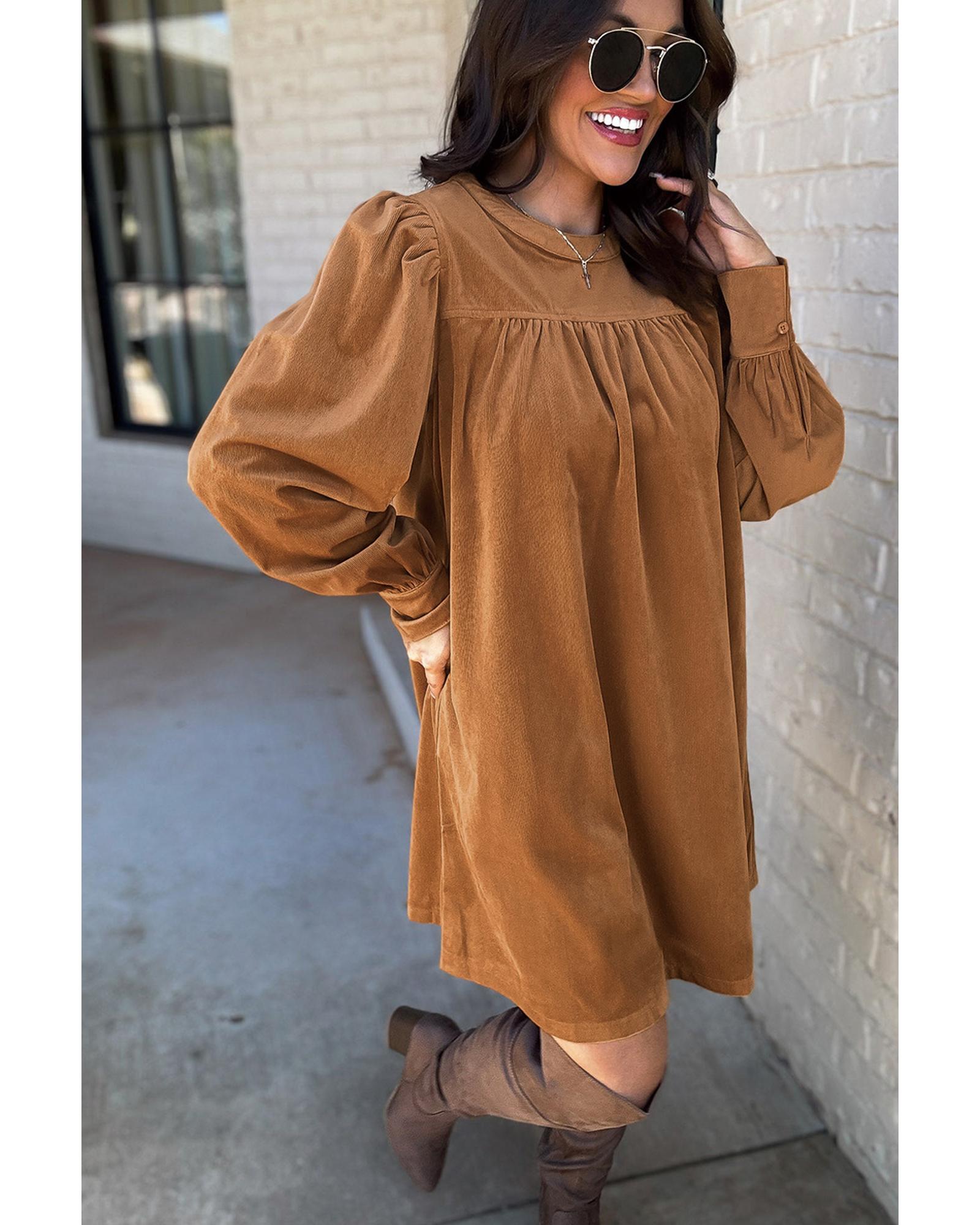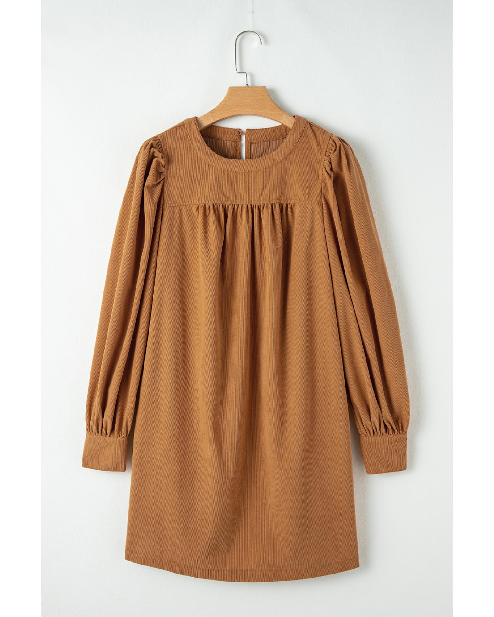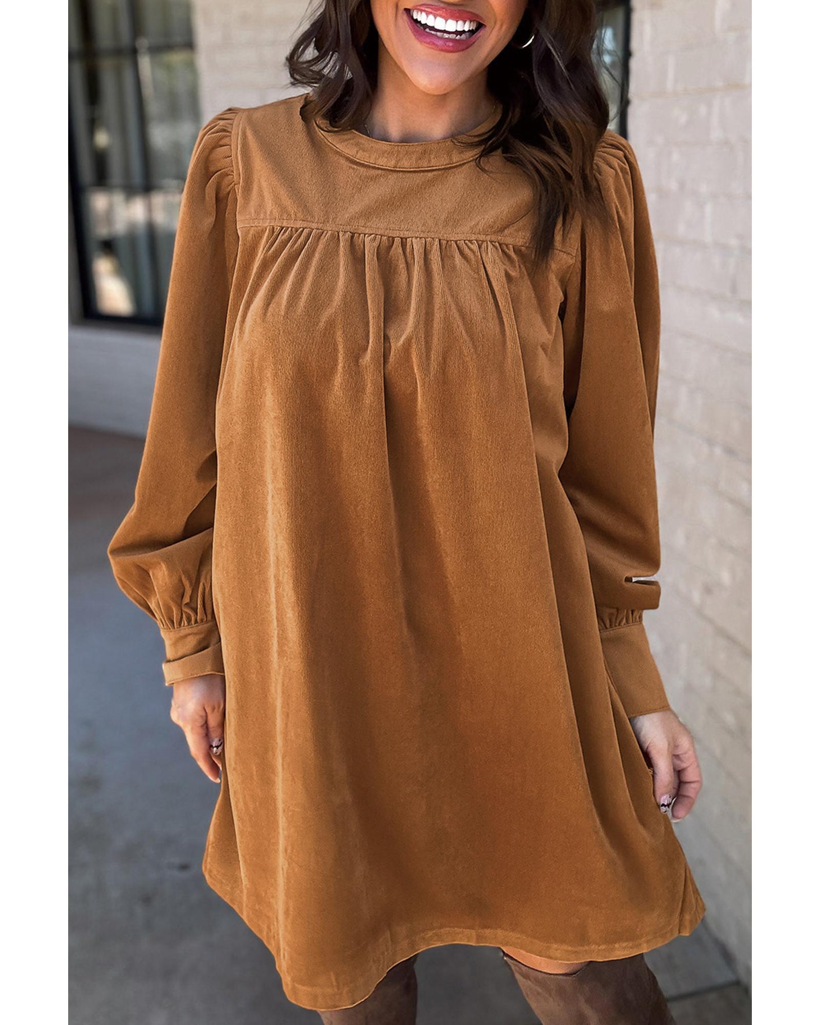 This dress features a luxurious corduroy fabric with a stylish pleated design and puff sleeves, creating an elegant and feminine look. Its classic shift silhouette offers a universally flattering fit, making it suitable for various occasions. The dress combines trendy elements with timeless style for a sophisticated appearance.