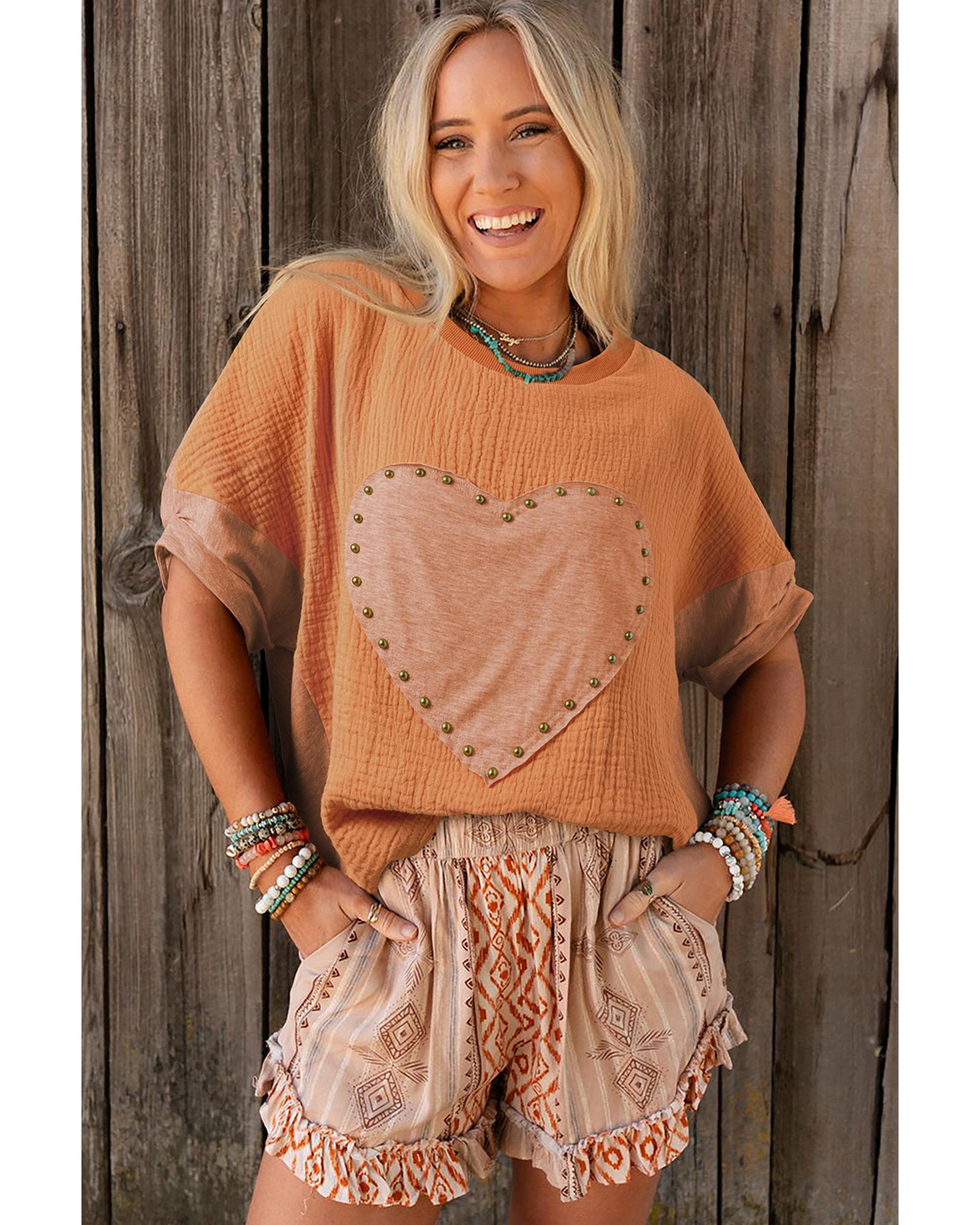 Desert Gold Stud Heart Patch Textured Front Dolman Top – S