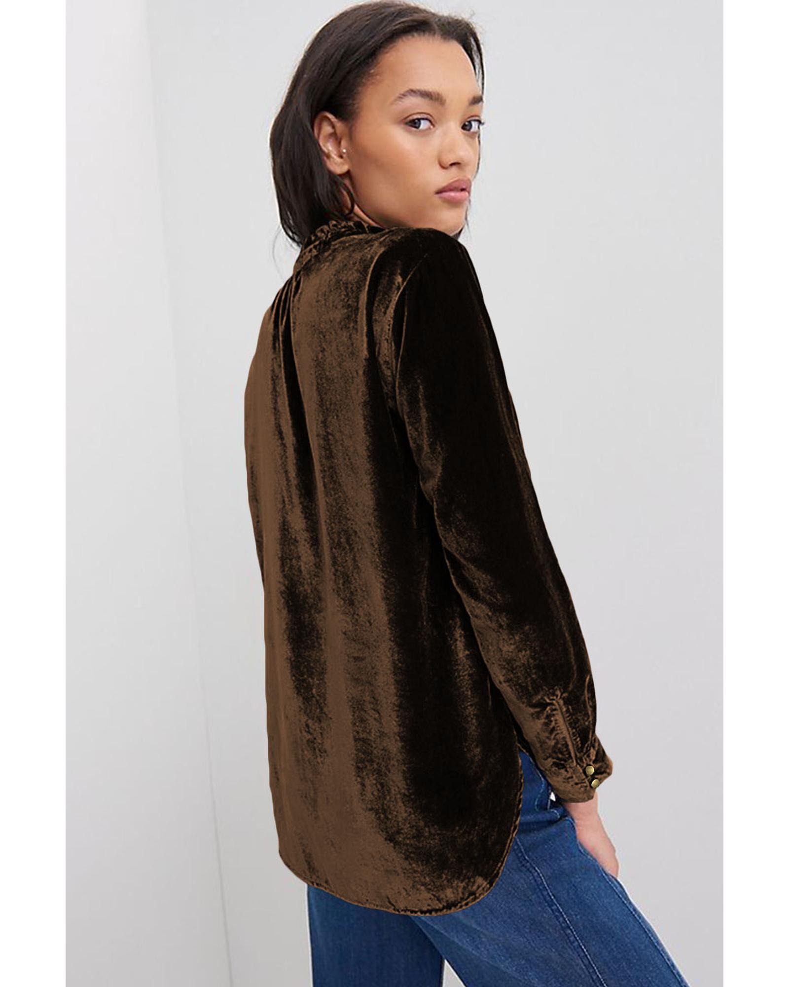 This velvet top features a stylish design with a frilled neck and buttoned front, offering a trendy and feminine look. Made from luxurious fabric, it is versatile and easy to pair with various bottoms, making it suitable for different occasions and styles.