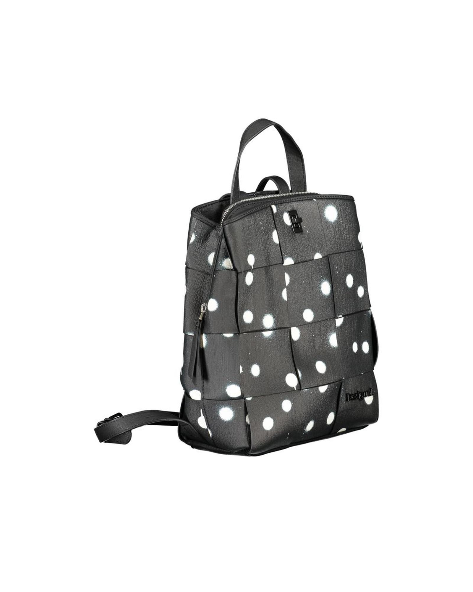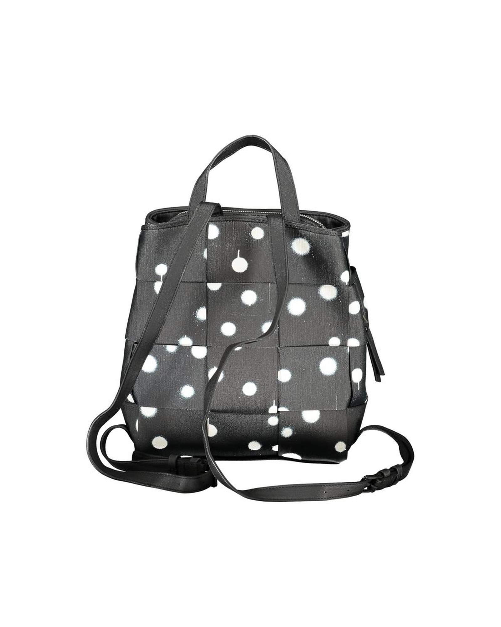 This stylish and functional black polyethylene backpack is designed for everyday use. It features a playful polka dot pattern with contrasting details, making it a versatile accessory for women. The backpack offers multiple compartments and pockets for organized storage, along with secure closures for added safety. Comfortable to carry with a handle and adjustable straps, it combines practicality with a fashionable look.