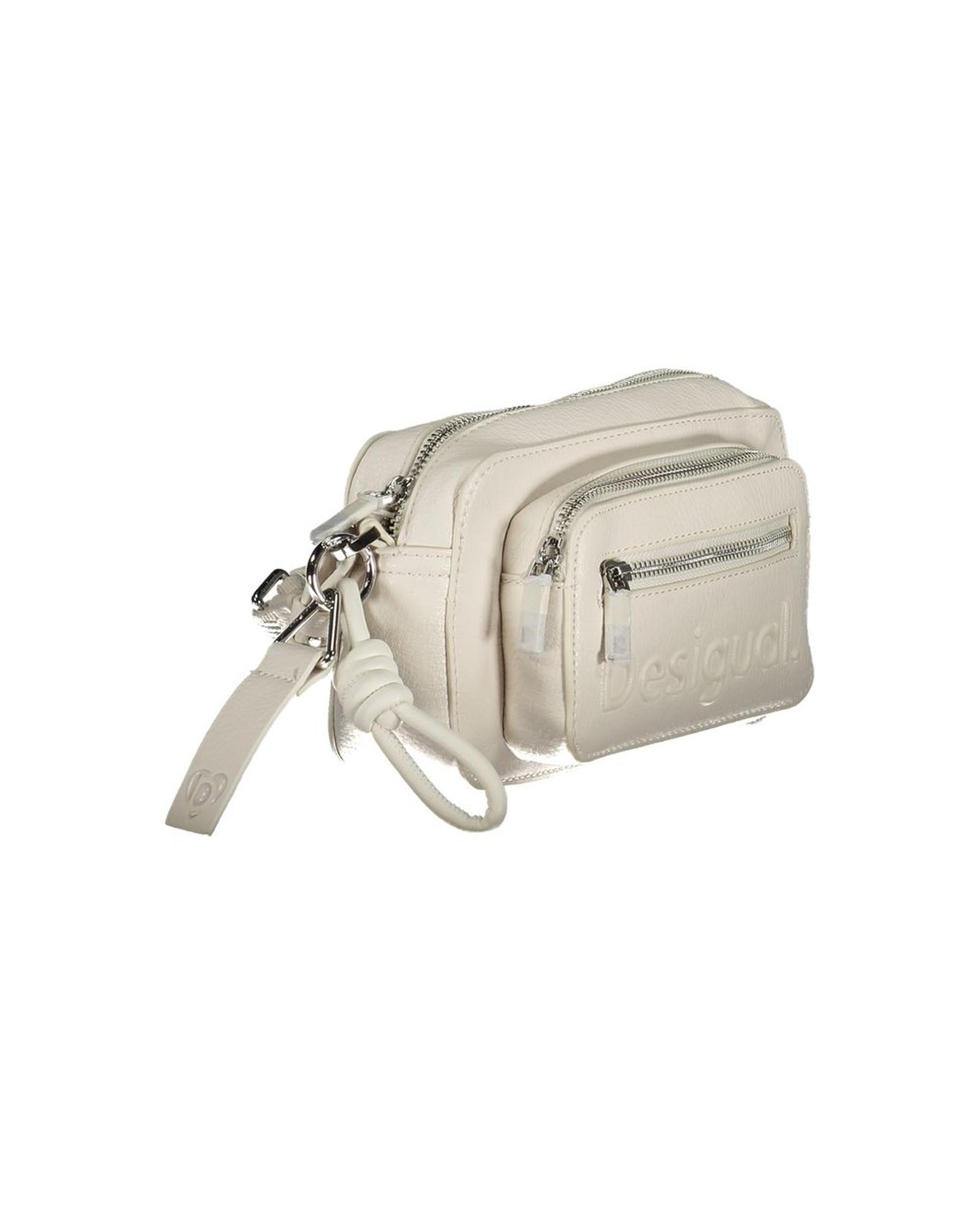 This handbag is crafted from durable white polyethylene material, offering a stylish and practical accessory for everyday use. It features versatile carrying options with a removable shoulder handle and an adjustable, removable shoulder strap. The bag provides ample storage with multiple external and internal pockets, secured by a zip closure for added security. A brand logo adds a touch of detail to the design.