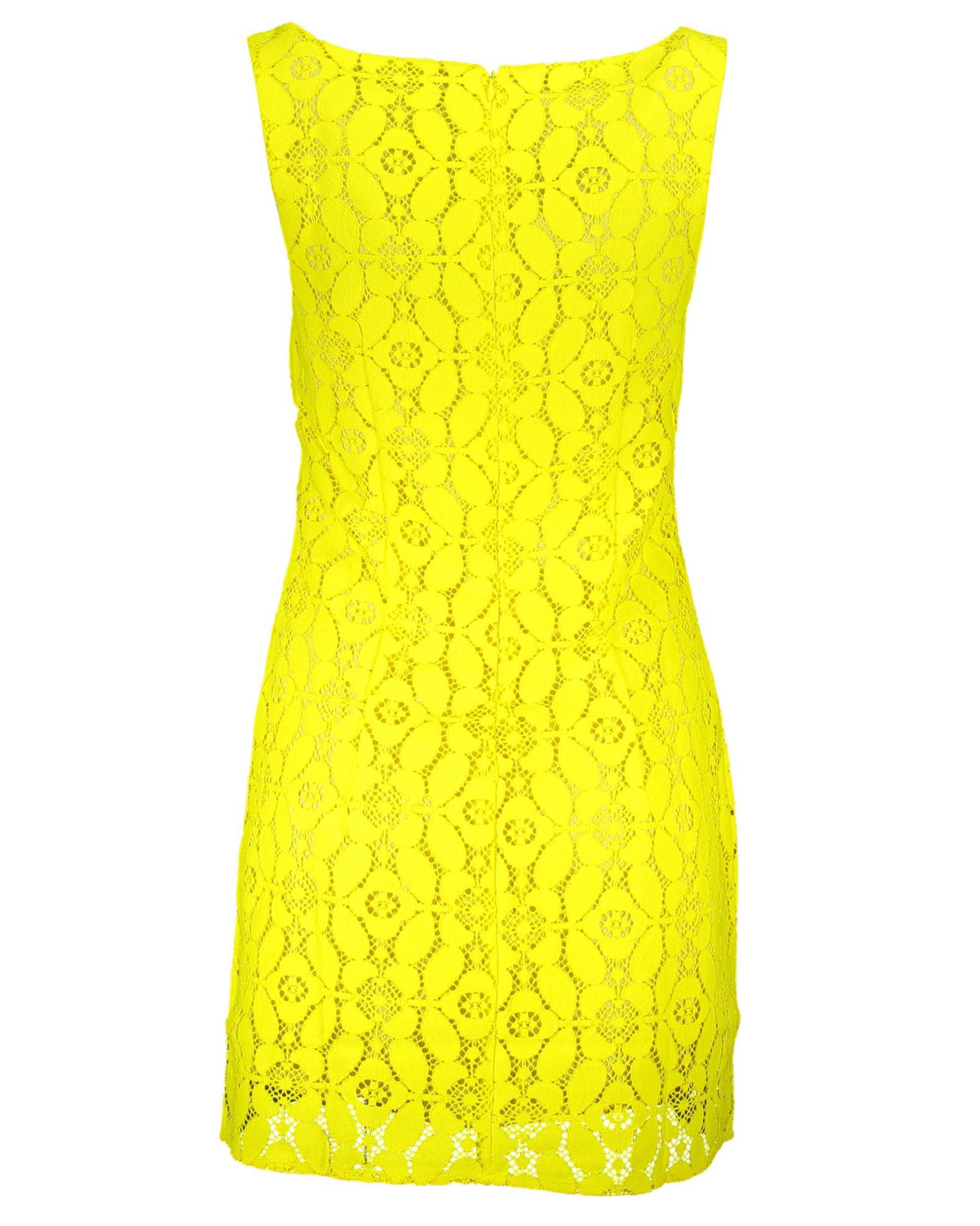 This vibrant yellow polyester dress is designed for women who want to make a bold fashion statement. It features a sleeveless, short silhouette with a square neckline and a back zipper for easy wear. The dress is fully lined and includes contrasting details to enhance its stylish appearance.