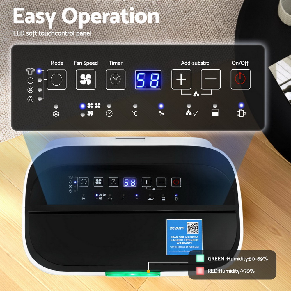 This 3-in-1 unit functions as a dehumidifier, fan, and clothes dryer, suitable for spaces up to 195 square meters. It effectively removes excess moisture, helping to prevent mold and mildew, and features a large water tank, overflow protection, and multiple drainage options for convenience. The soft-touch control panel, humidity indicator lights, and programmable timer allow for easy operation, while quiet performance ensures minimal disturbance. Designed with mobility in mind, it includes casters and handles for easy movement and requires no assembly.