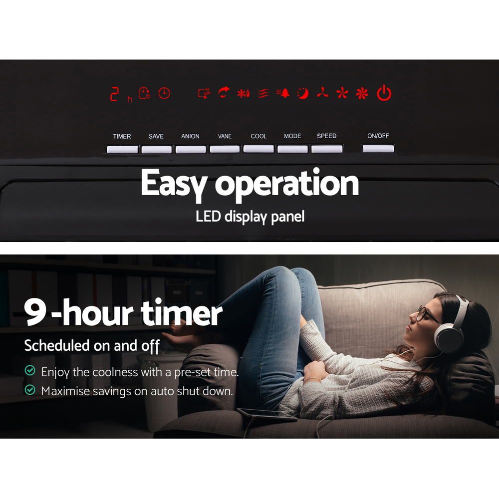 This evaporative air cooler combines cooling and humidifying functions in a compact and stylish design. It features adjustable louvres, oscillation, and multiple modes to provide a comfortable environment. The unit includes a water tank, removable filters, and a built-in ioniser to improve air quality. Easy to operate with a digital control panel and remote control, it offers versatile performance for various needs.