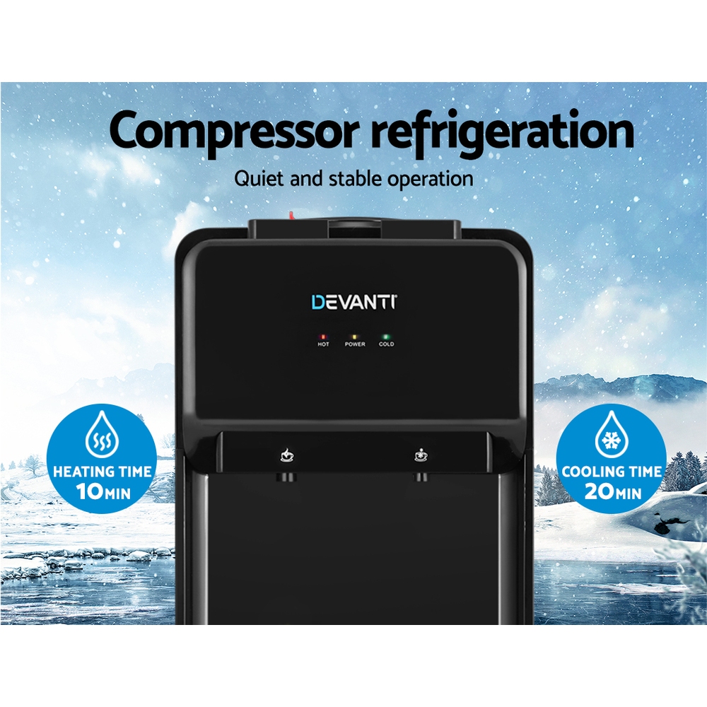 This compact water cooler provides convenient access to clean and pure water, suitable for use on desktops or kitchen benches. It features dual hot and cold water outlets with easy-to-use switches, allowing you to dispense water at the desired temperature quickly. The cooler employs compressor cooling technology to chill water efficiently and heats water rapidly for hot beverages. Safety features include a child-lock function and protections against over-current, overheating, electric shocks, and dry running. The design includes a removable drip tray, a water guide plate for standard water bottles, and anti-slip feet for stability.