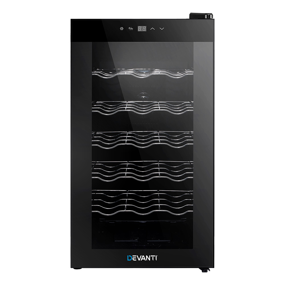 This wine cooler is designed to store up to 18 bottles of wine in a compact and stylish unit. It features advanced thermoelectric cooling technology to maintain precise temperatures, ensuring your wines are kept in optimal condition. The unit includes a touch control panel for easy temperature adjustments, built-in LED lighting for clear visibility, and a UV-resistant glass door for added protection. Its quiet operation and energy-efficient design make it a reliable choice for wine storage.