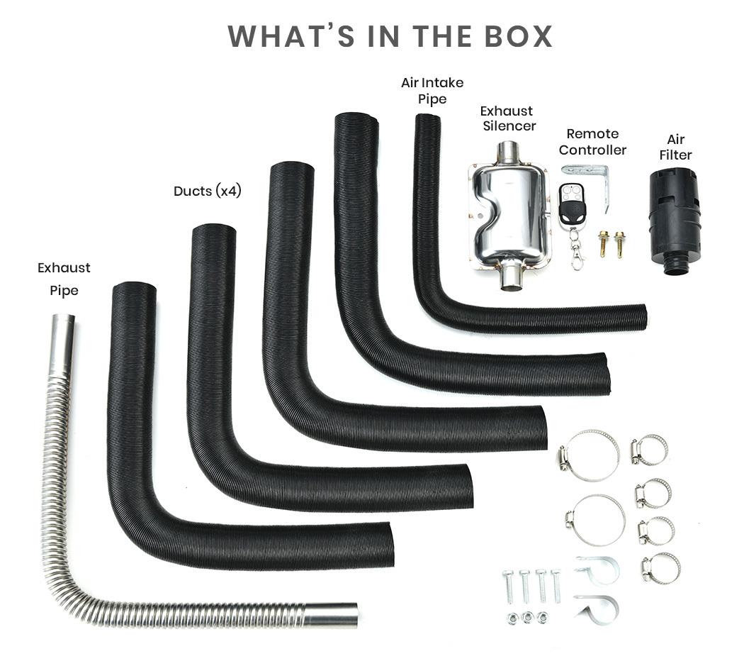 - Mounting hardware kit (nuts, bolts, ducting, and exhaust hose clamps)