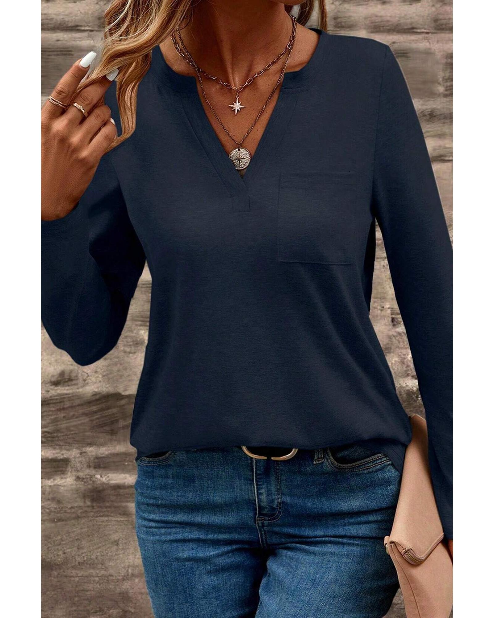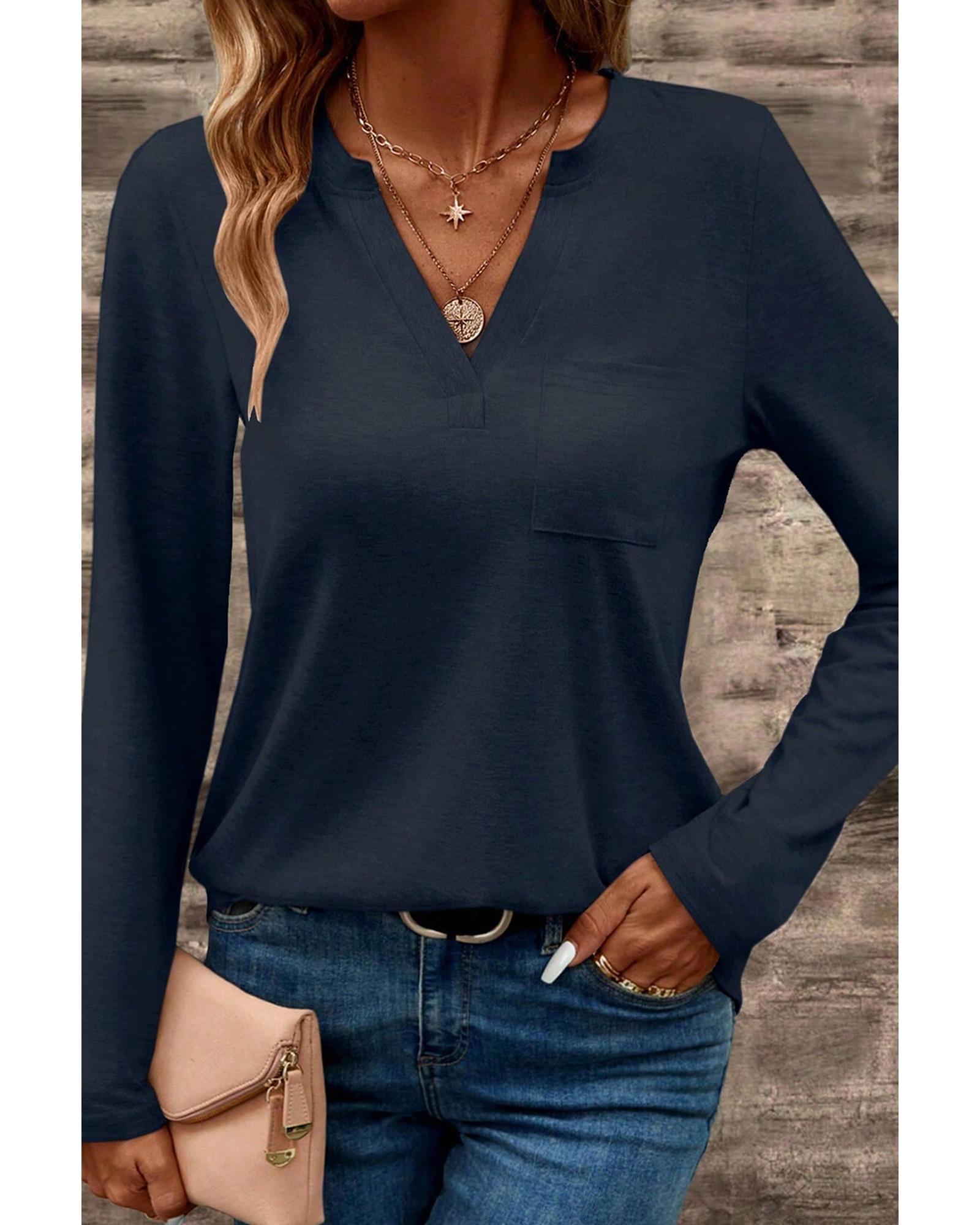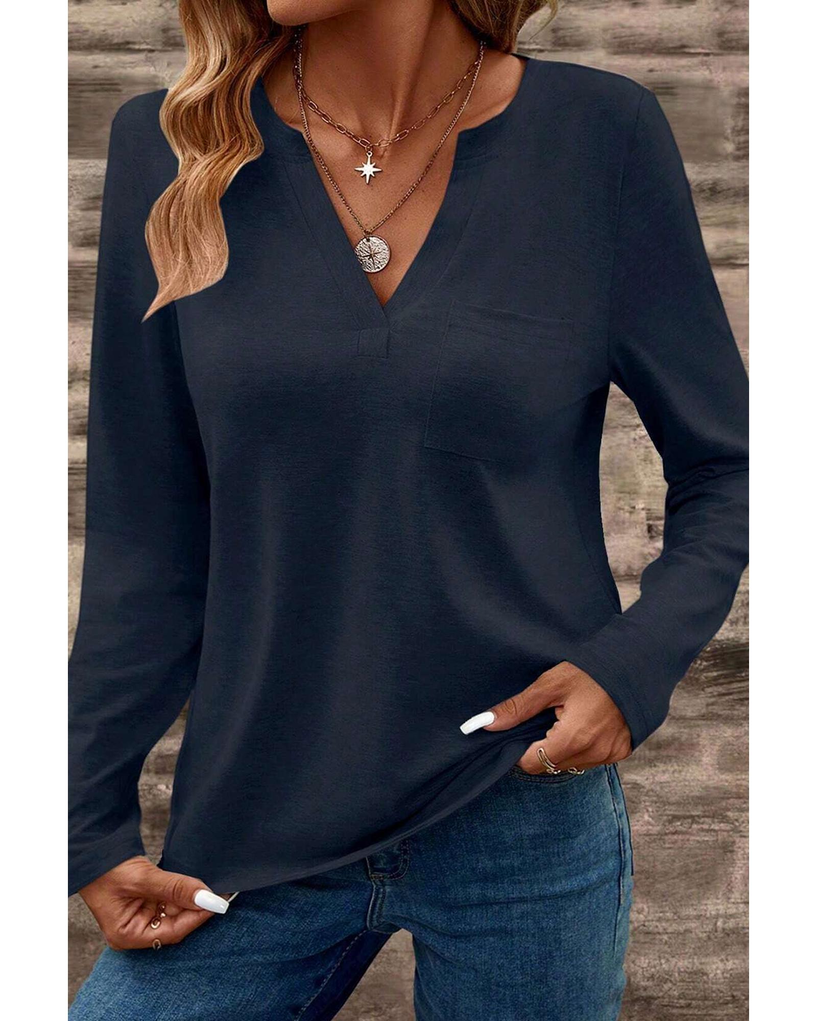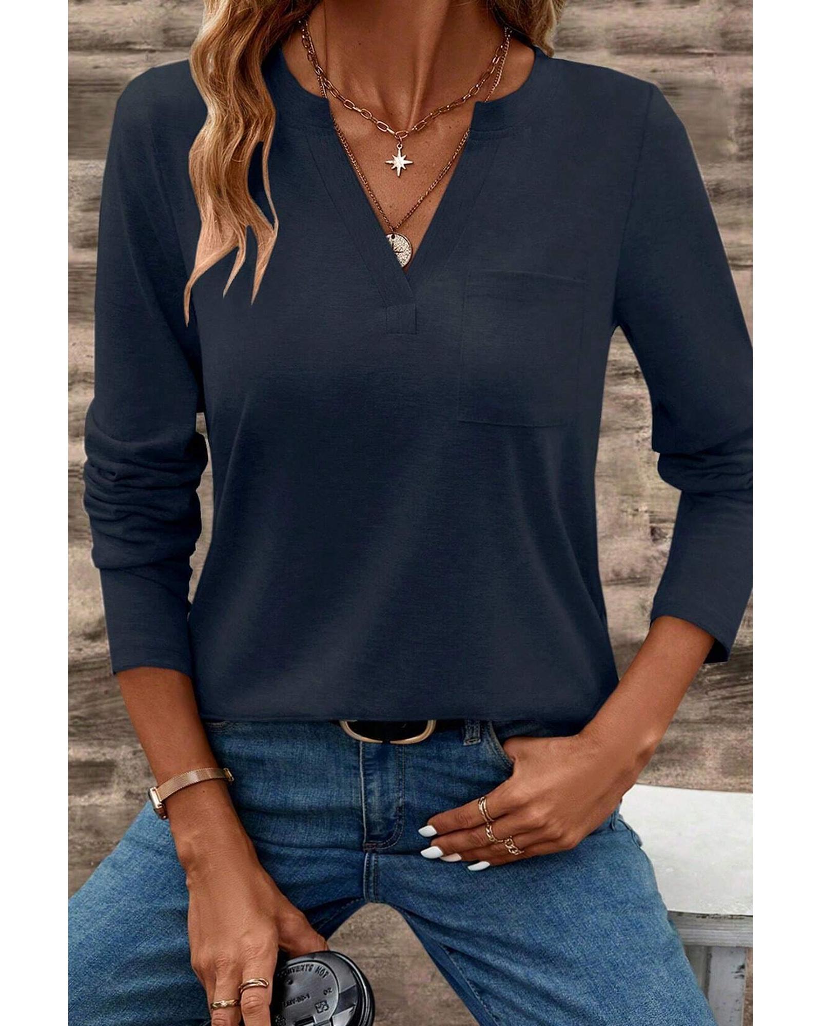 This long sleeve T-shirt features a trendy fitted design with a notched V neckline and a patched pocket for added detail. Made from high-quality fabric, it offers a flattering fit and is available in multiple sizes with high elasticity, ensuring comfort and style.
