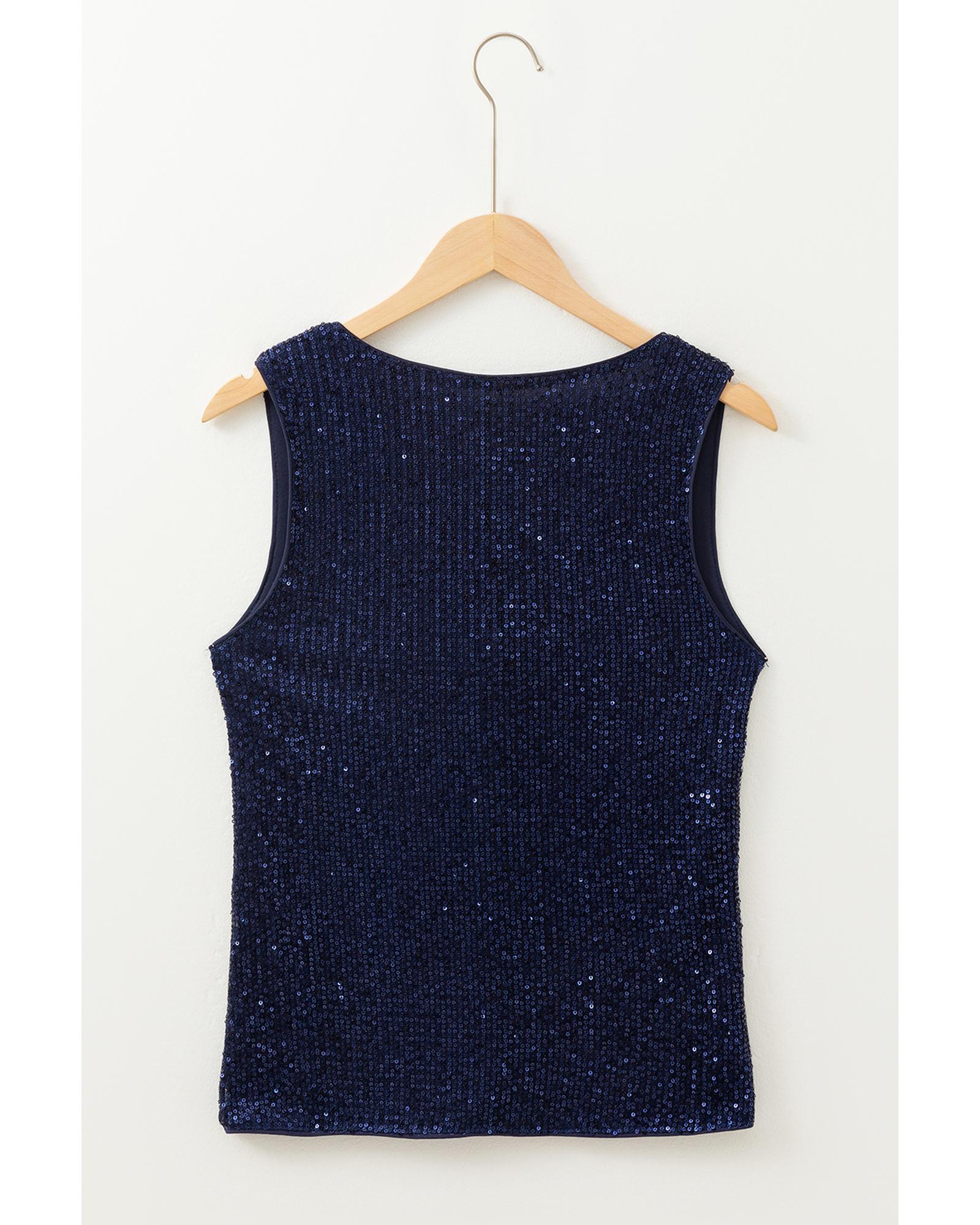 This stylish tank top features a deep V neckline and dazzling sequins that catch the light, creating a confident and alluring look. The sleeveless design showcases your arms, while the button front detail adds a touch of refinement. Perfect for achieving a chic yet casual appearance, this top offers a comfortable fit with high elasticity.