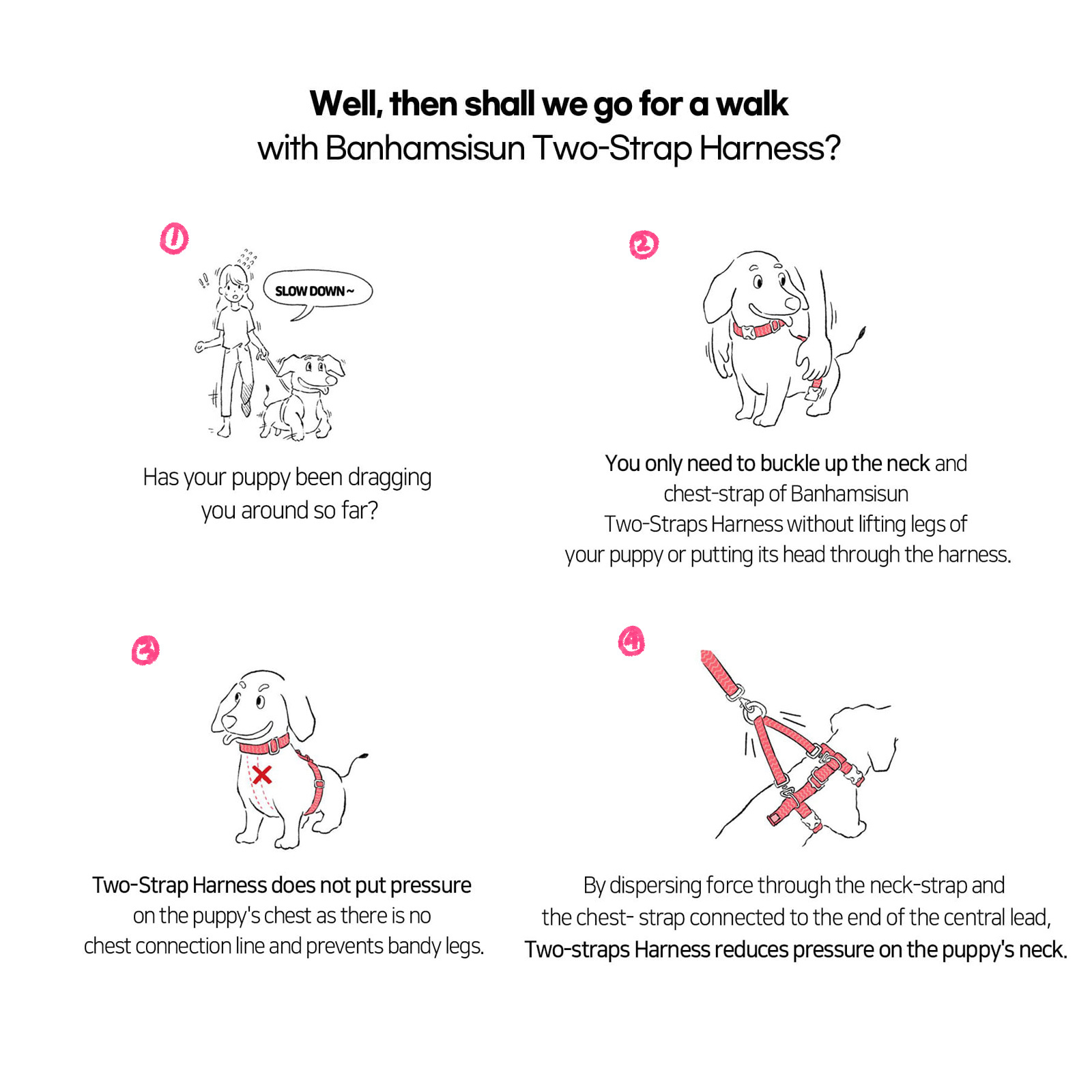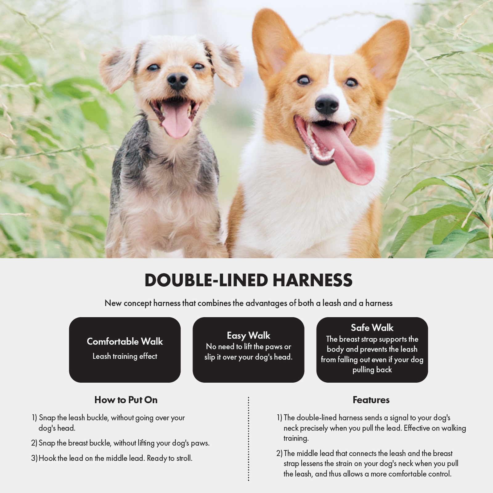 This dog harness features a double-lined strap design that provides all-day comfort and ease of use. It is designed to be put on effortlessly without lifting the dog’s legs or covering the head, reducing pressure on the neck and chest while allowing natural movement. The harness helps distribute leash force evenly, making walks more comfortable and controlled for both the pet and owner.