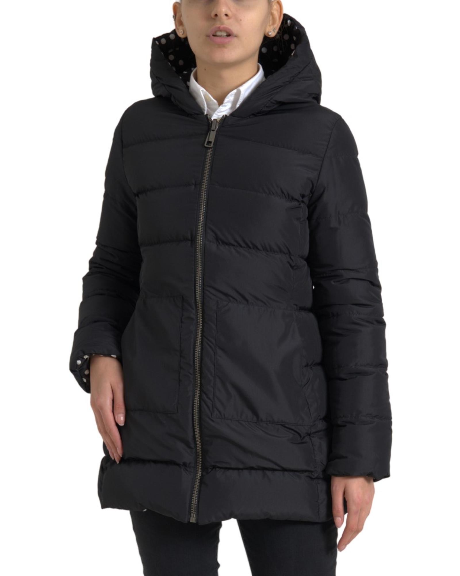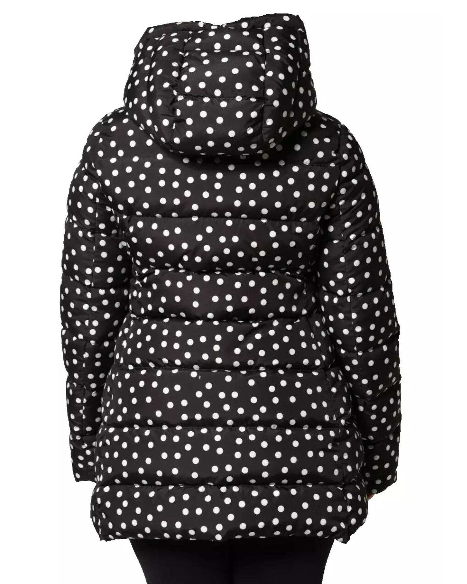 This women’s full zip hooded jacket features a sleek black design with a deep hood for a stylish and comfortable fit. The jacket is lined with a polka dot pattern, adding a touch of elegance. Made from high-quality polyester, it offers durability and a regular fit suitable for everyday wear.
