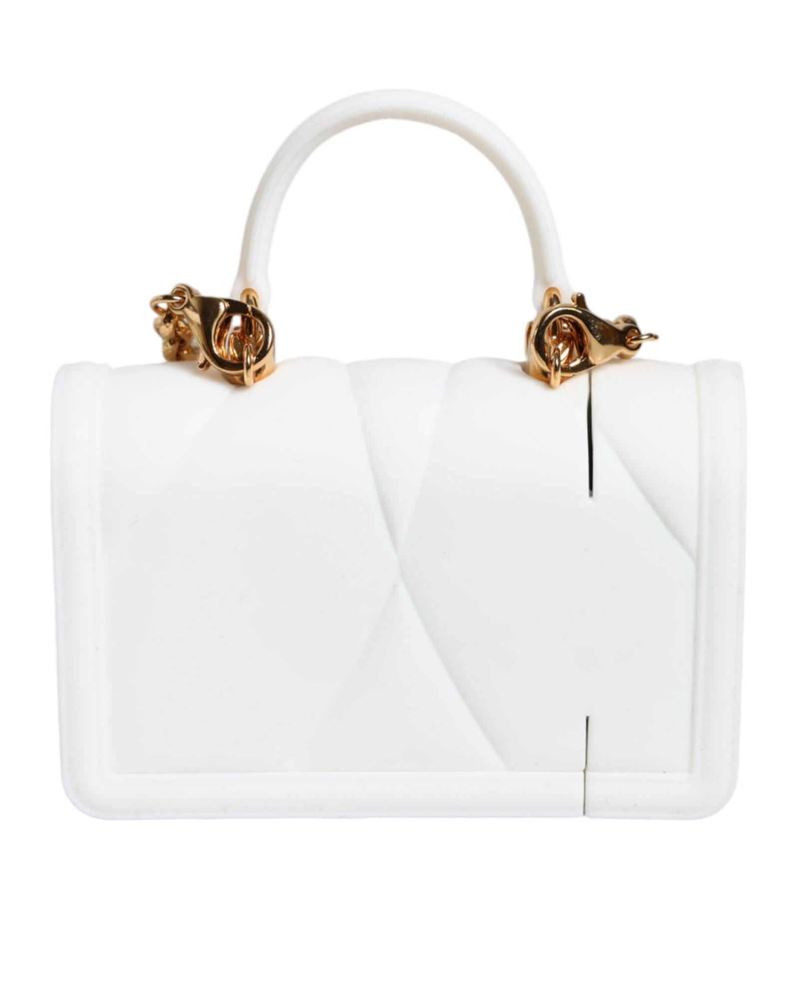 This product is a stylish silicone case designed to resemble a small handbag, providing a fashionable and protective cover for your AirPods. It features a quilted effect and a front logo plaque, adding a touch of elegance. The case includes an optional chain strap and a round top handle for versatile carrying options. Its sleek white color with gold metal detailing makes it a chic accessory for everyday use.