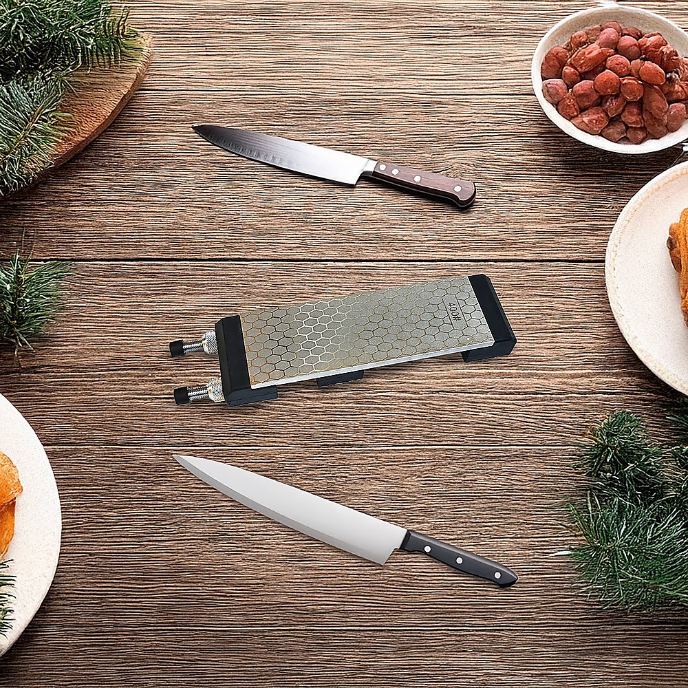 This double-sided diamond knife sharpener is designed to maintain the sharpness of your knives with precision. It features two different grit sides for versatile sharpening: a coarser 400-grit side and a finer 1000-grit side. The durable diamond surface ensures long-lasting performance, suitable for kitchen use as well as sharpening blades for sports or woodworking tools.