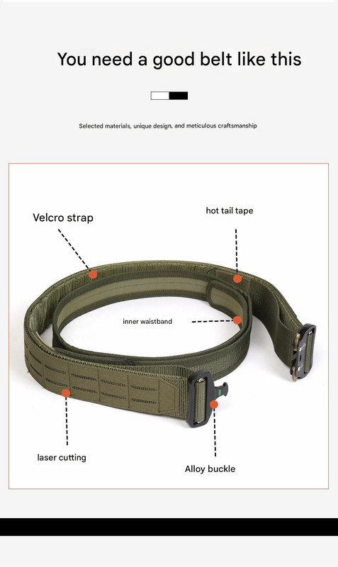 This tactical belt features a dual-layer design with a quick-release alloy buckle, providing reliable performance and convenience. It is suitable for outdoor activities such as tactical operations, mountaineering, and hiking, offering durability and adjustable comfort.