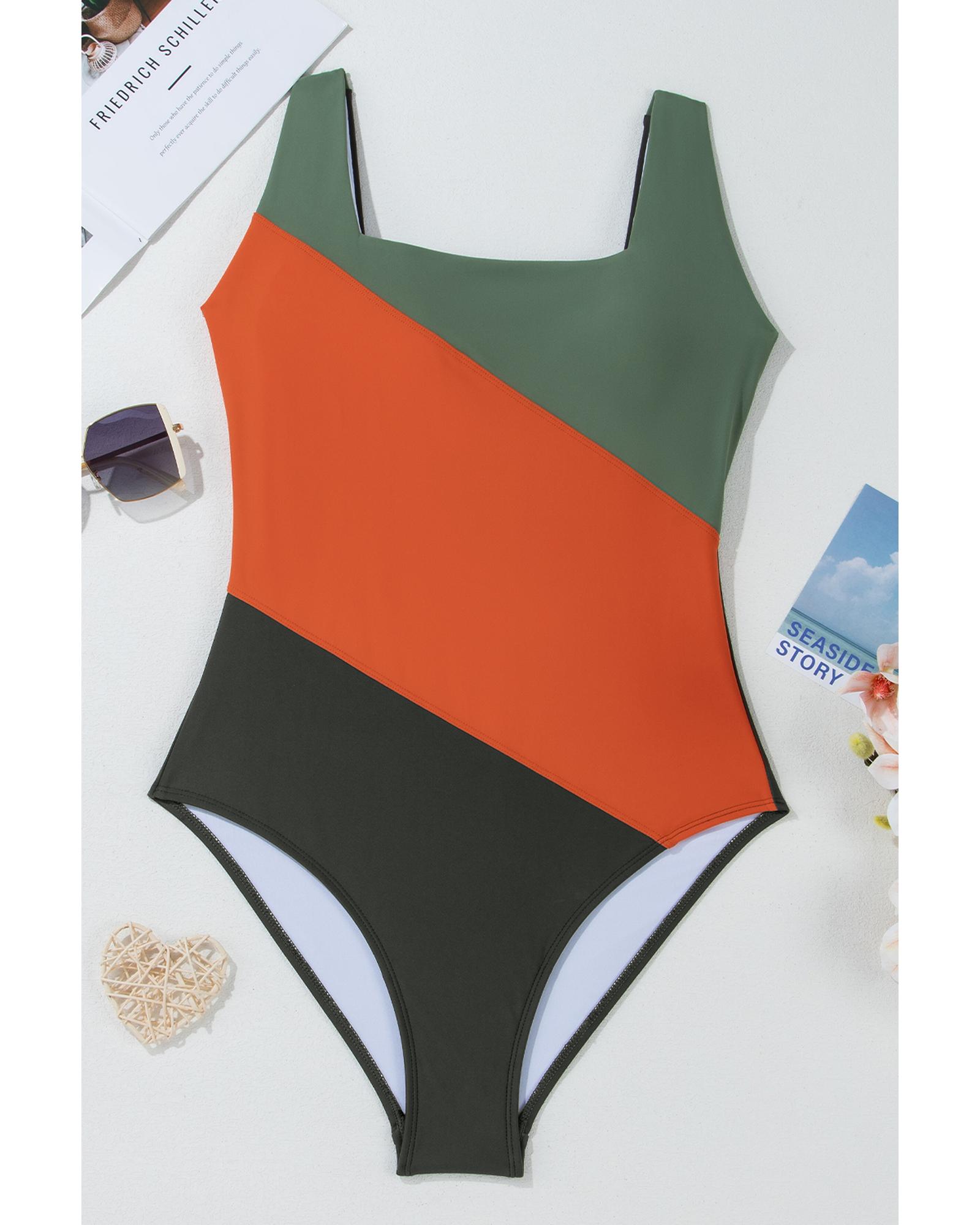 This stylish one-piece swimsuit features a colorblock design and a square neckline, offering a trendy and flattering look. It is designed with high elasticity for comfortable wear and provides full coverage for confidence and support. The swimsuit includes removable bust pads for customizable support, making it suitable for various preferences and body types.