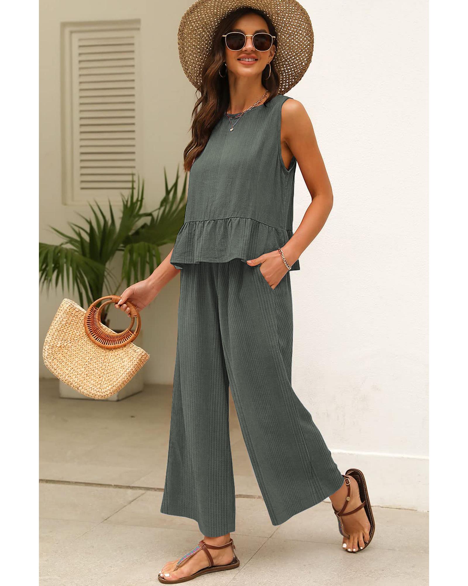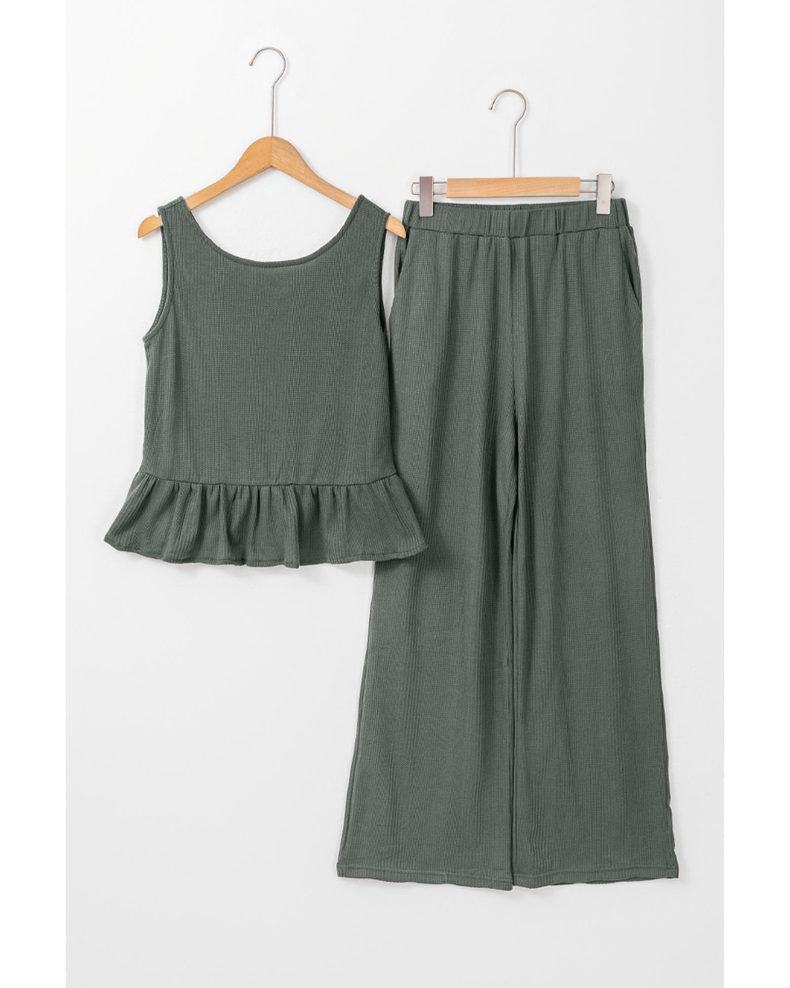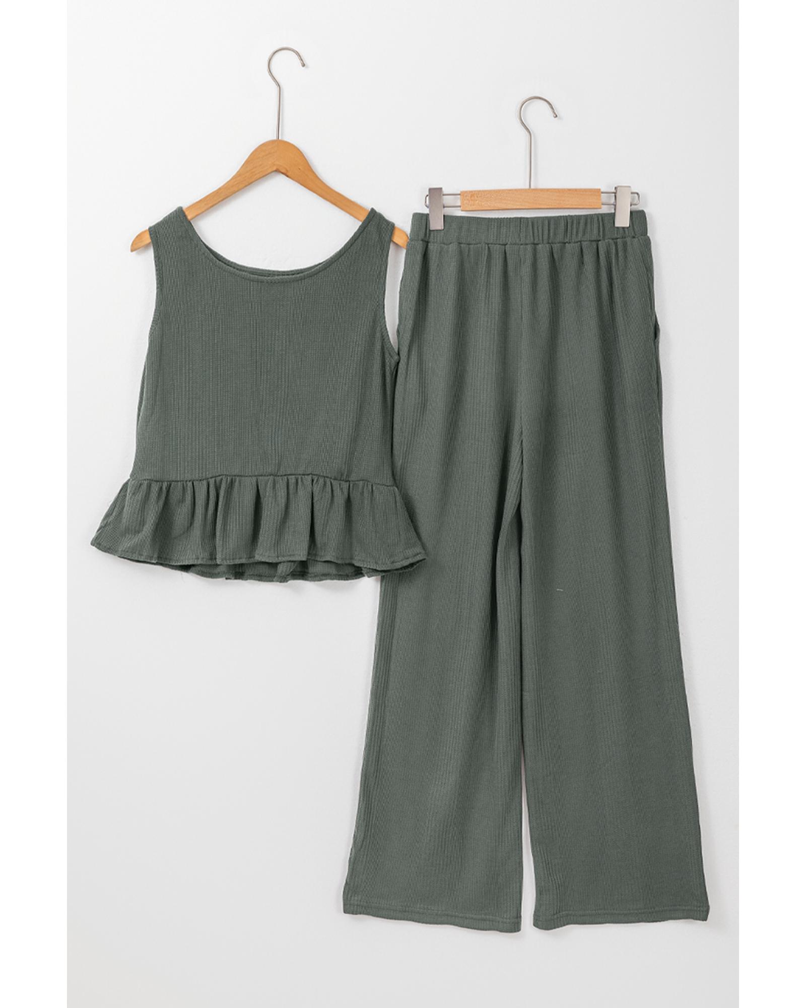 This set features a coordinated tank top and pants in a solid green color, designed for comfortable and stylish loungewear. The ribbed texture adds visual interest, while the ruffled hem on the tank top provides a playful and romantic touch. The sleeveless design makes it easy to layer, making it versatile for various occasions.