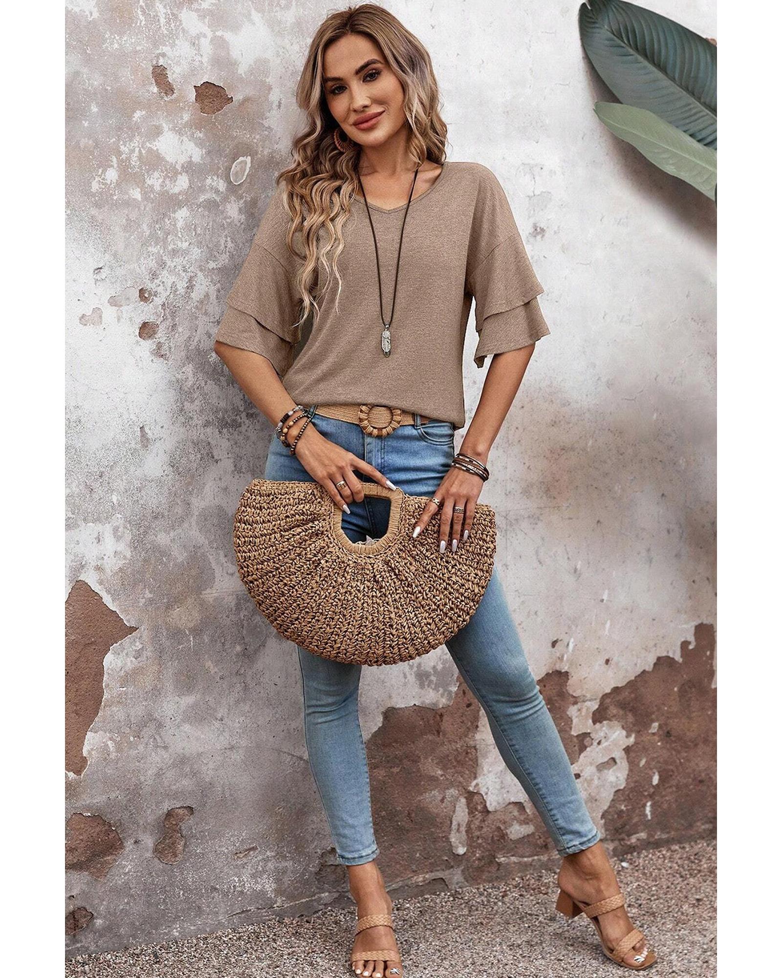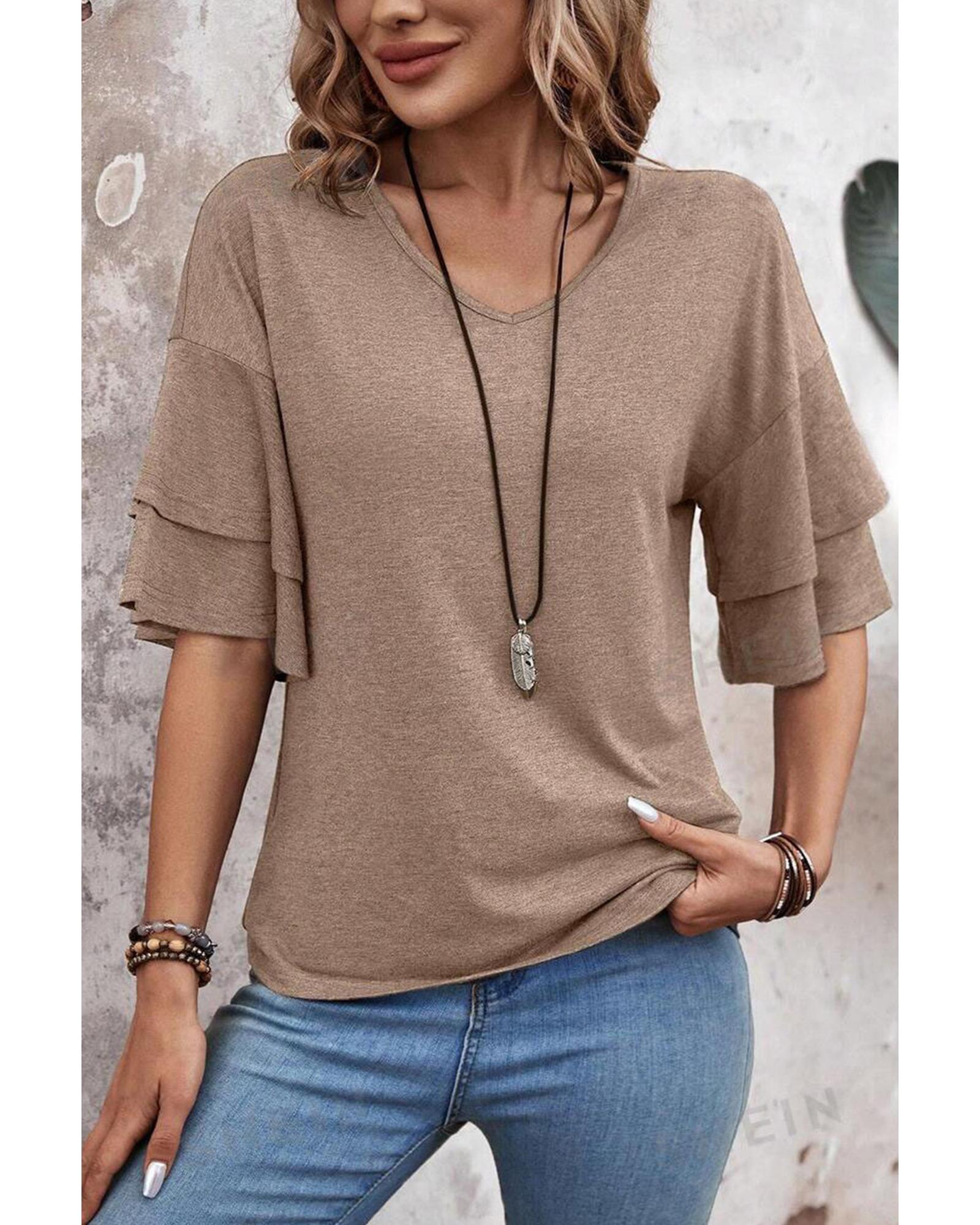 This V-neck double layer sleeve T-shirt offers a stylish and comfortable casual look. Designed with a solid color and a relaxed fit, it is suitable for everyday wear and versatile styling.