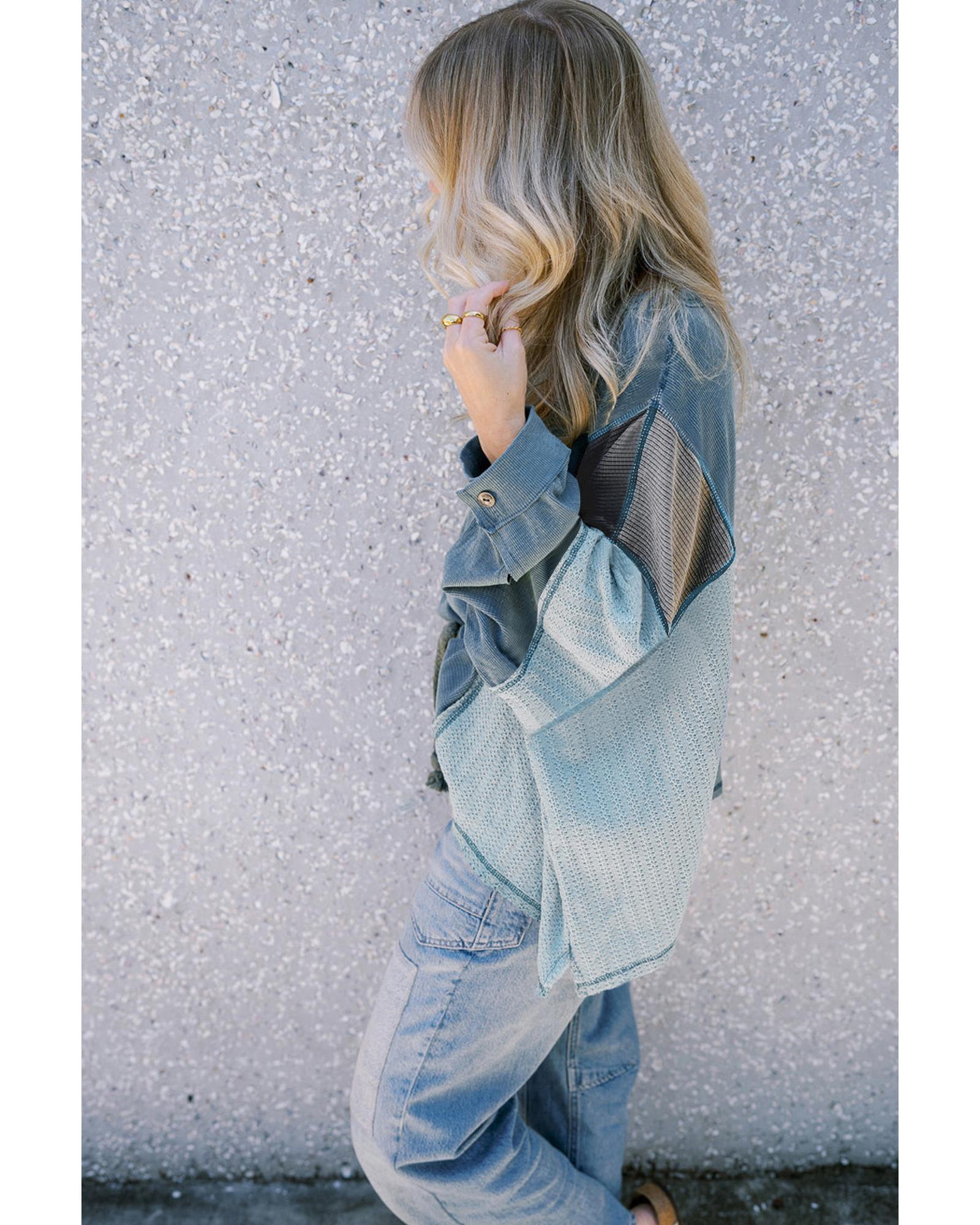 Dusk Blue Colorblock Stitching Patchwork Buttoned Long Sleeve Top – S