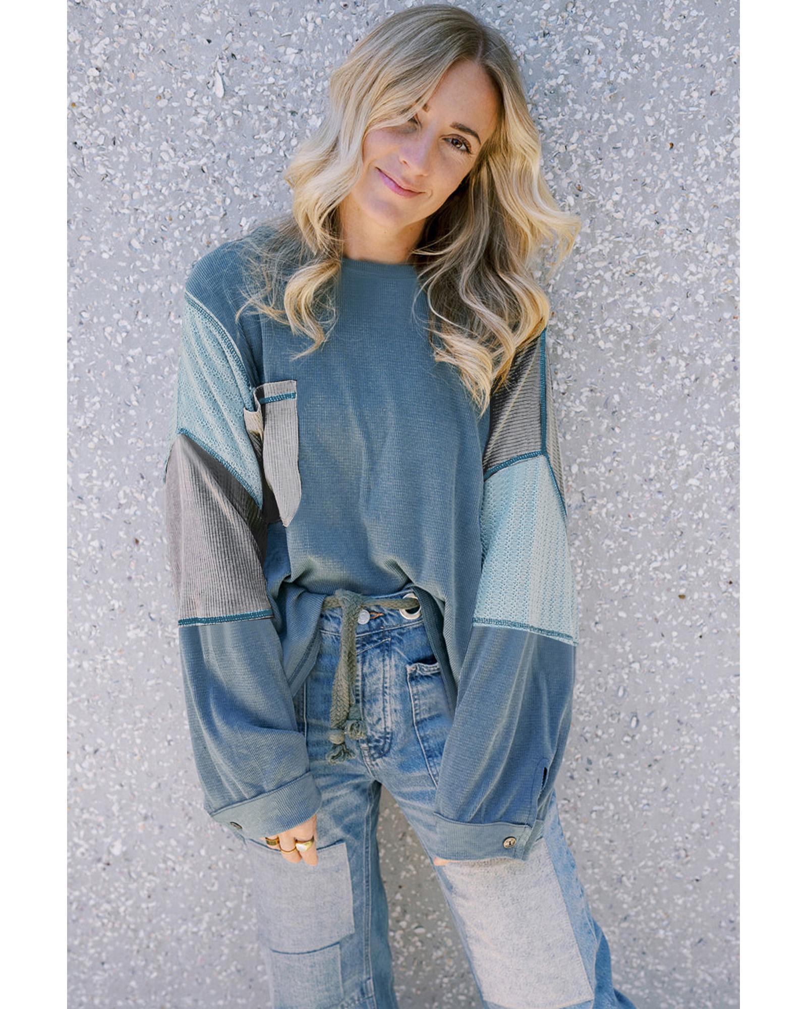 This long sleeve top features a stylish dusk blue color with colorblock and patchwork detailing. Designed with a trendy fitted silhouette, it offers a polished and adjustable fit suitable for various styles. The exposed seam accents add a unique touch, making it a versatile addition to your wardrobe.