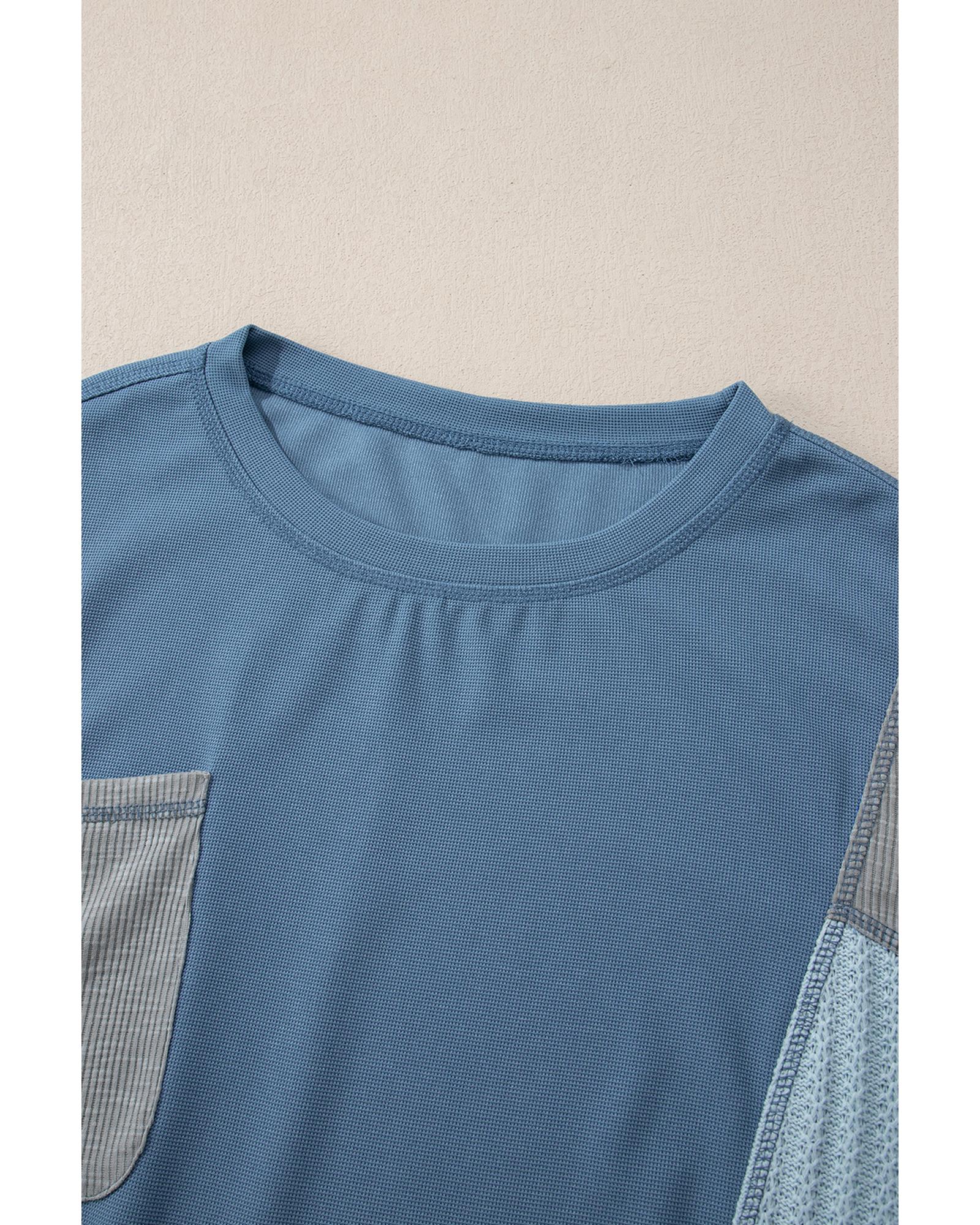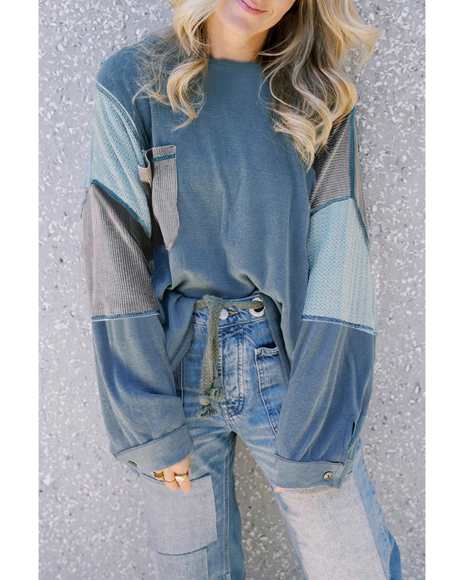 Dusk Blue Colorblock Stitching Patchwork Buttoned Long Sleeve Top – XL