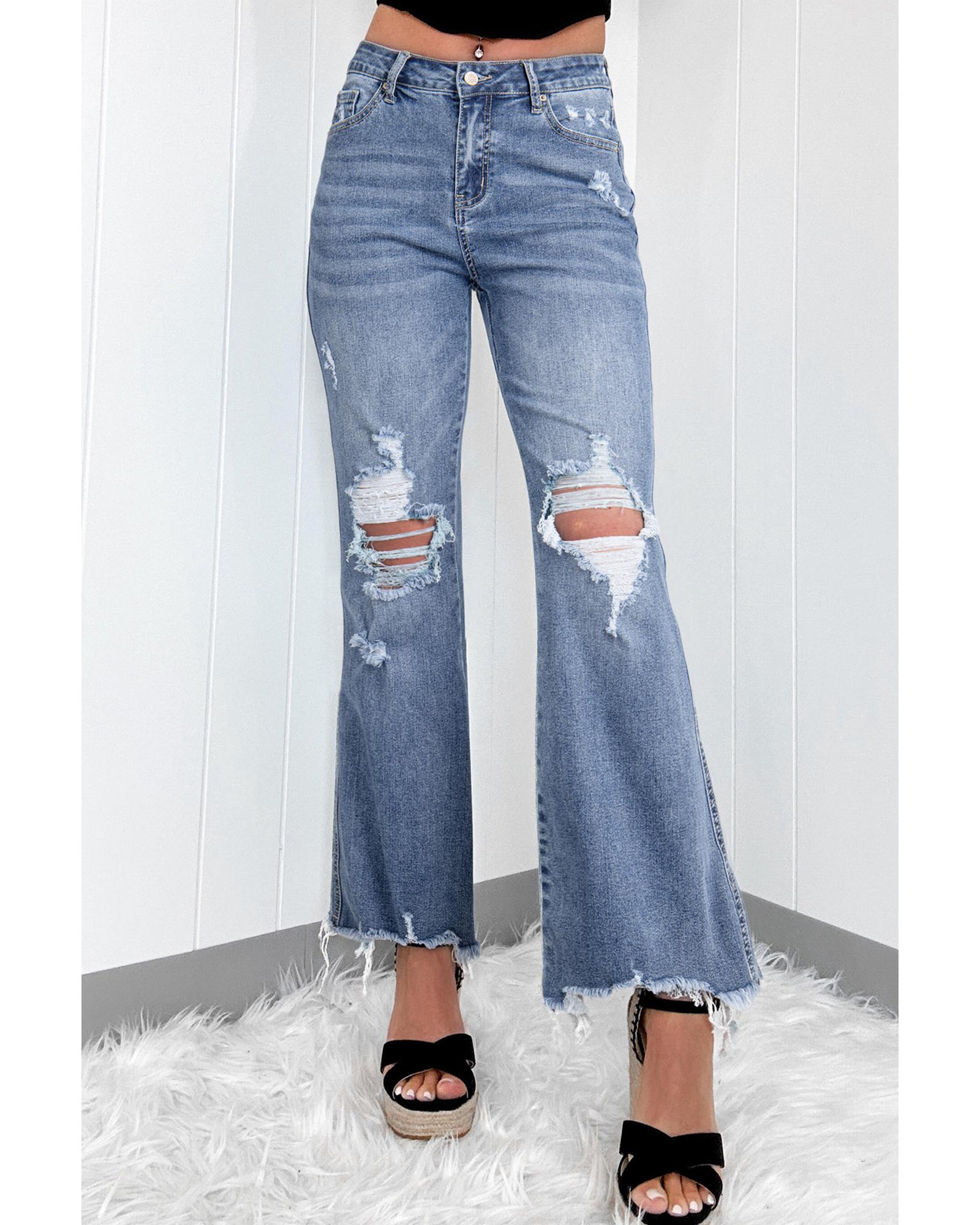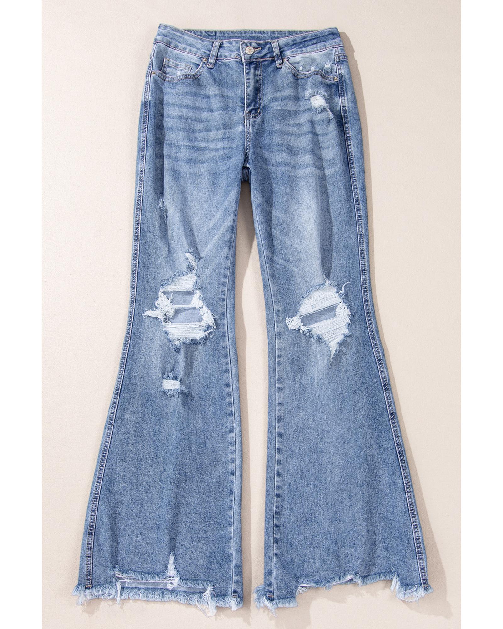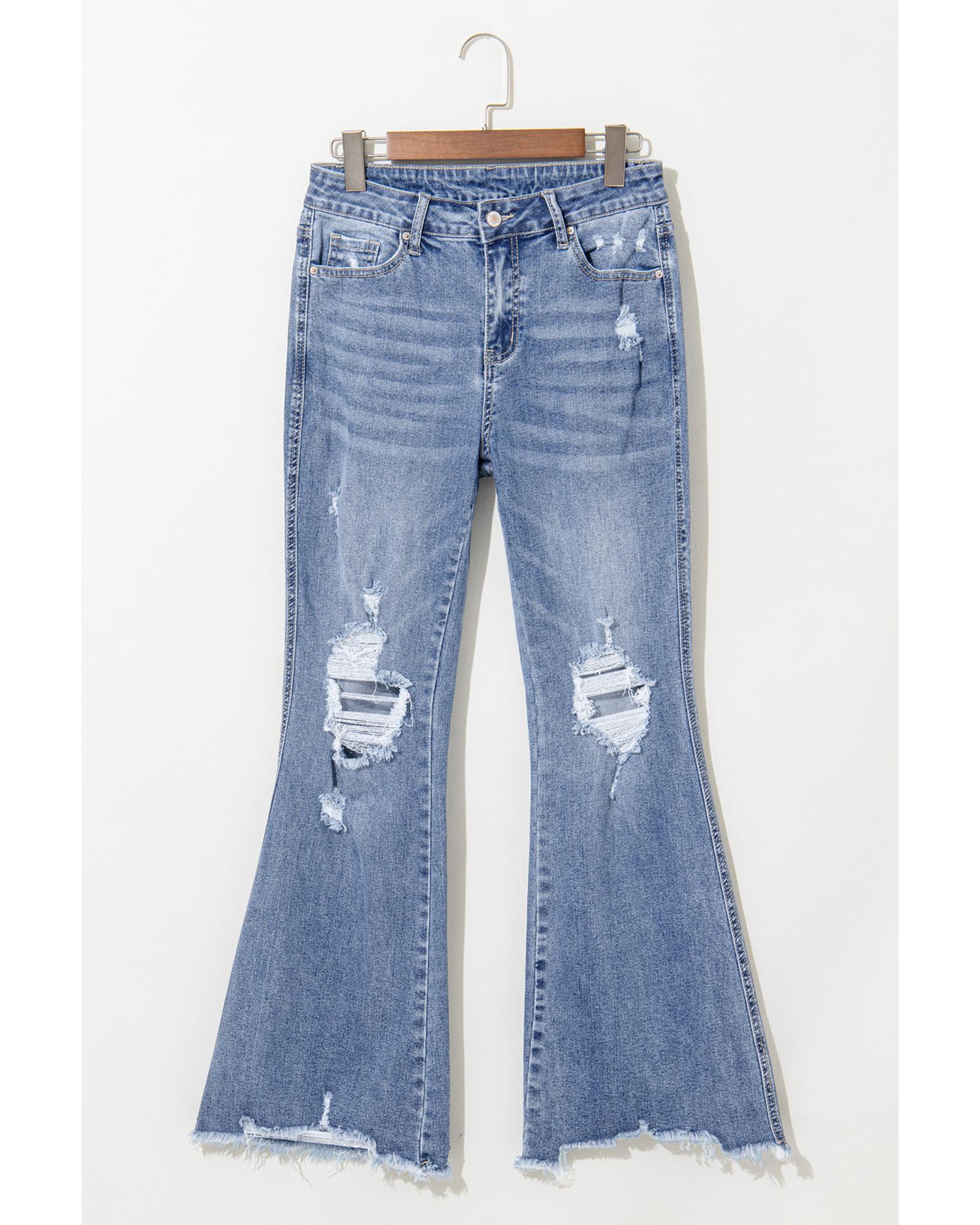 This pair of high-rise flared jeans features a stylish distressed hem and ripped details, offering a trendy and edgy look. Designed with a vintage-inspired aesthetic, these jeans combine modern fashion elements with a flattering fit that elongates the legs.
