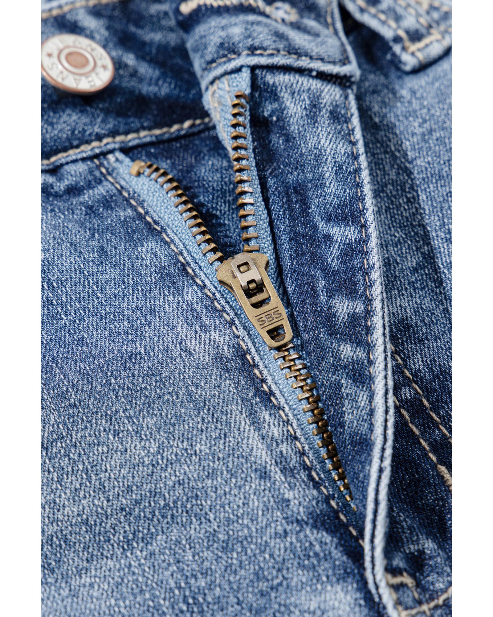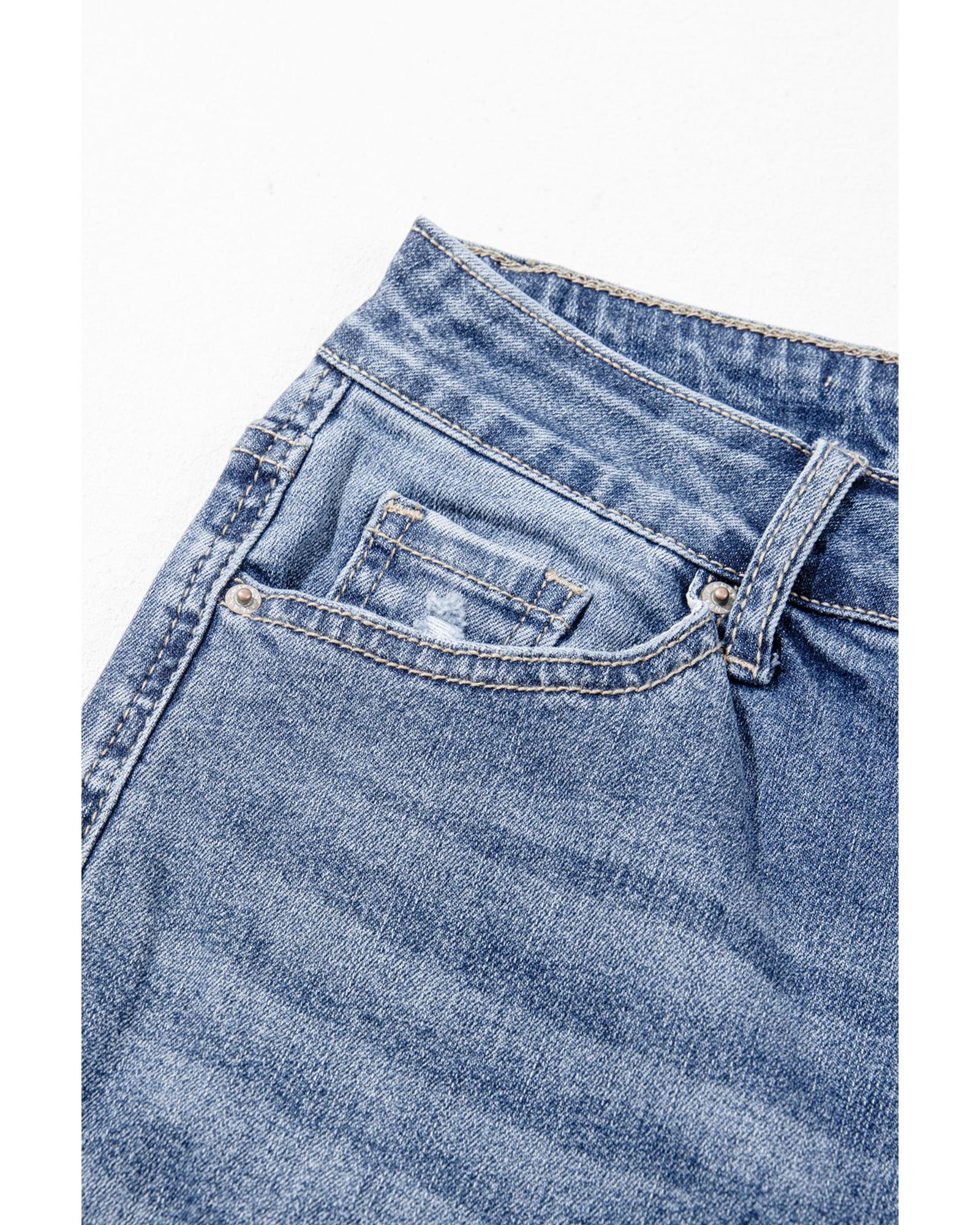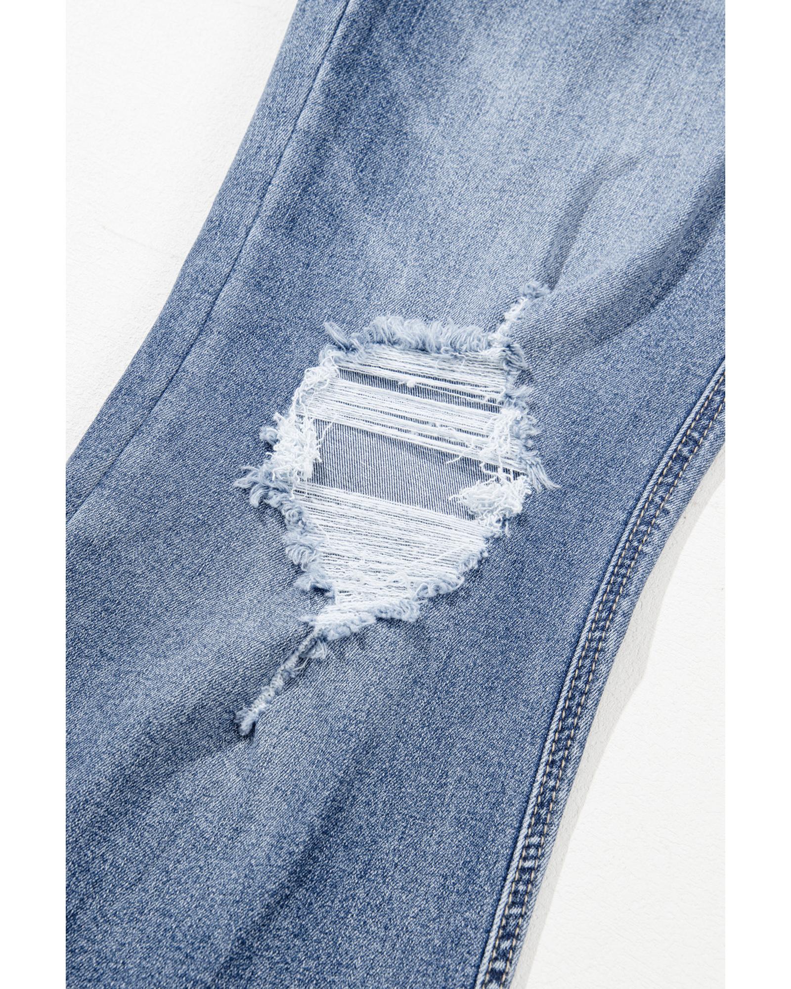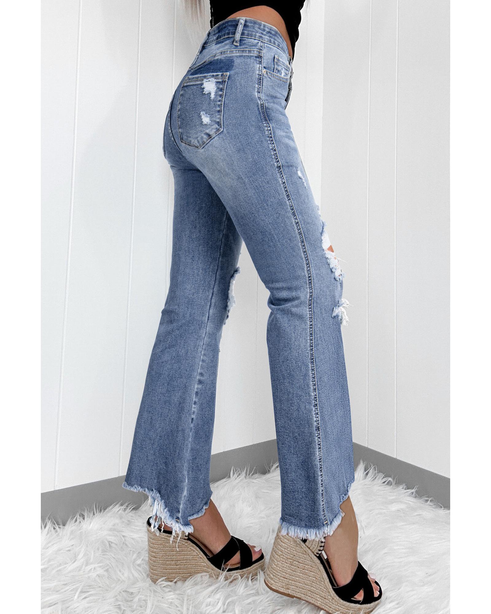 This pair of high-rise flared jeans features a stylish distressed hem and ripped details, offering a trendy and edgy look. Designed with a vintage-inspired aesthetic, these jeans combine modern fashion elements with a flattering fit that elongates the legs.