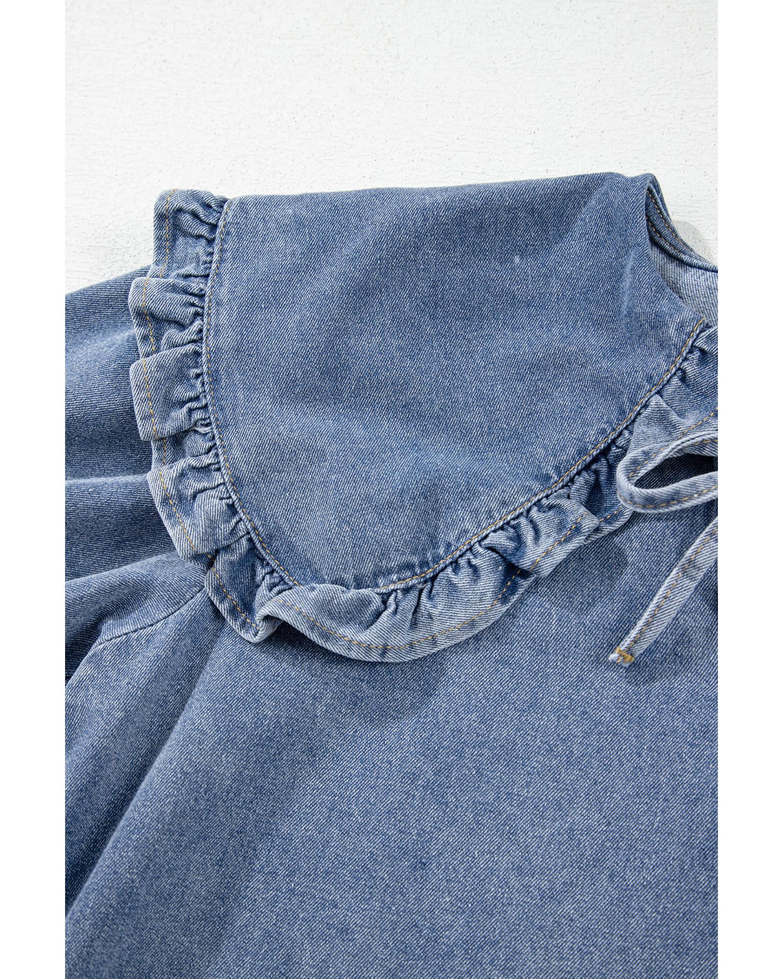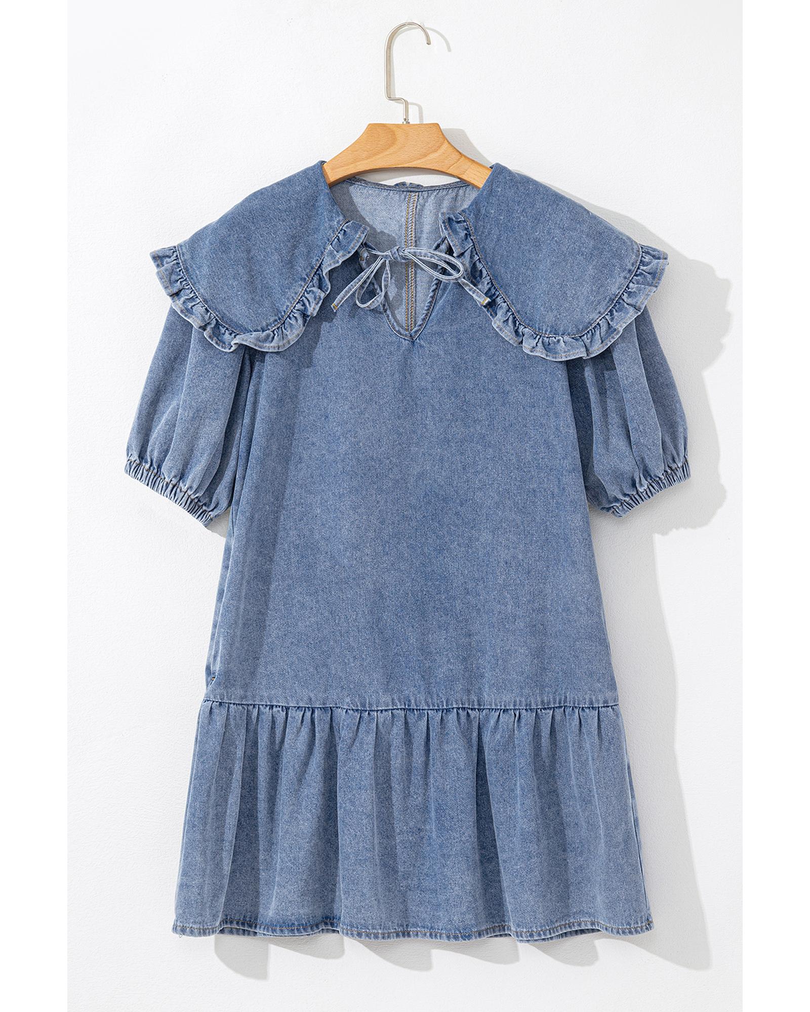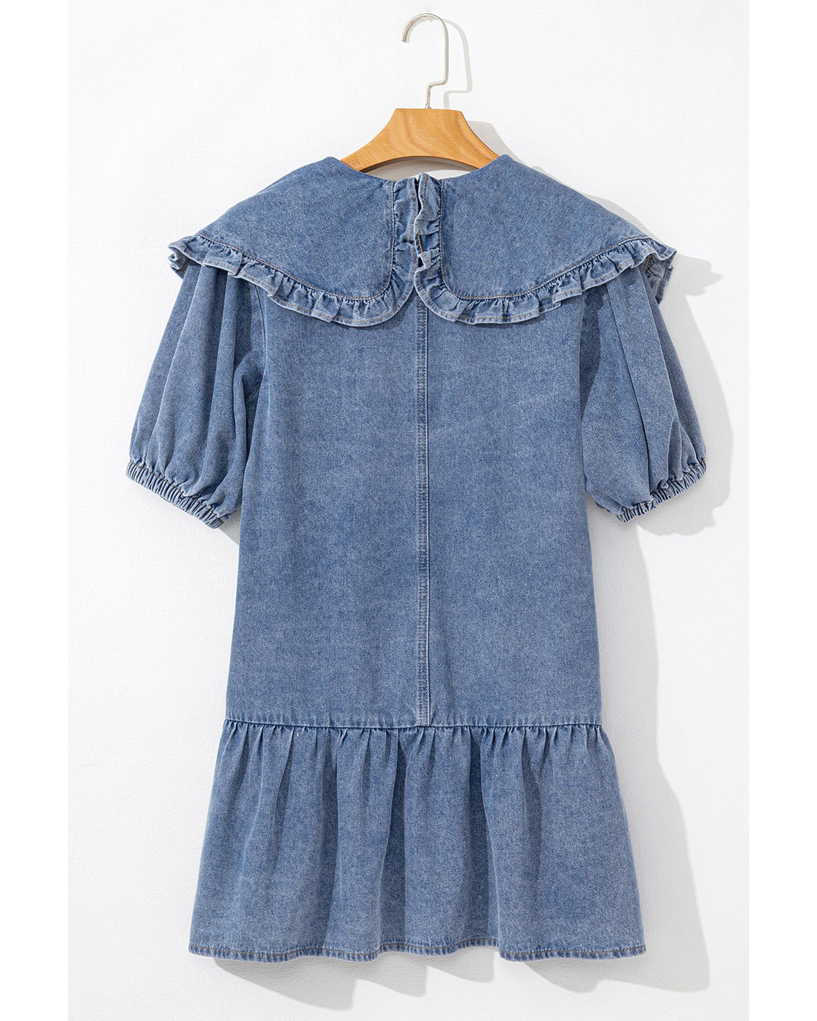 This denim mini dress features a stylish dusk blue color with feminine ruffled detailing and a classic collared neckline. Designed with puff sleeves and convenient side pockets, it offers a trendy and comfortable fit suitable for various occasions.
