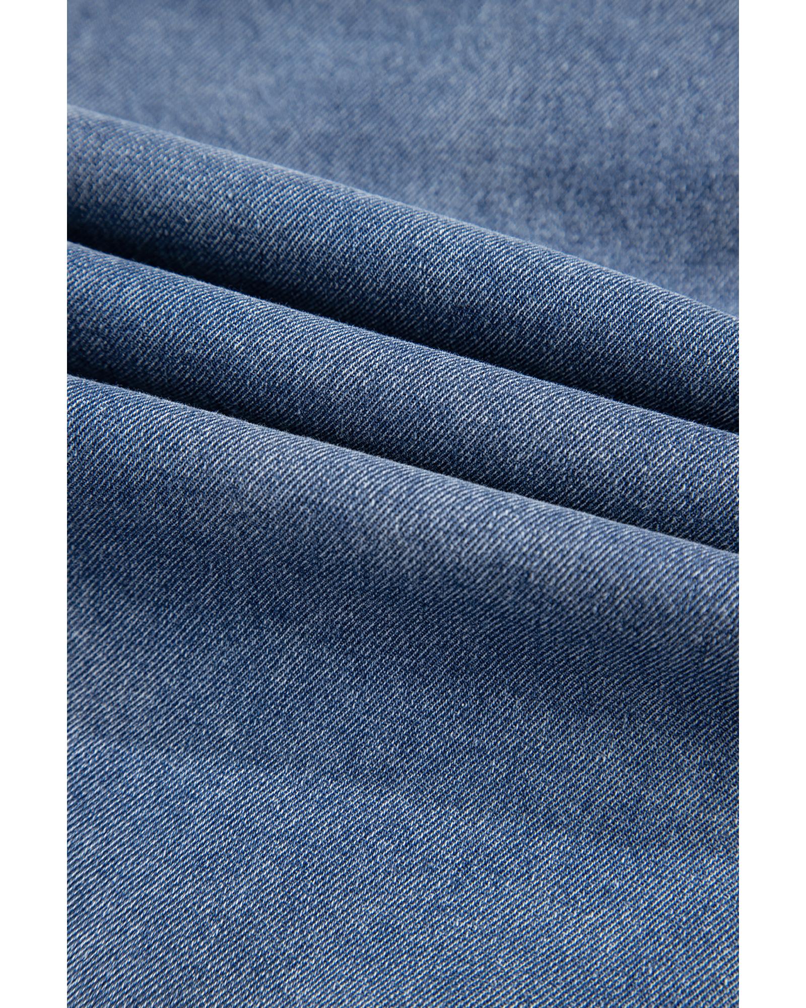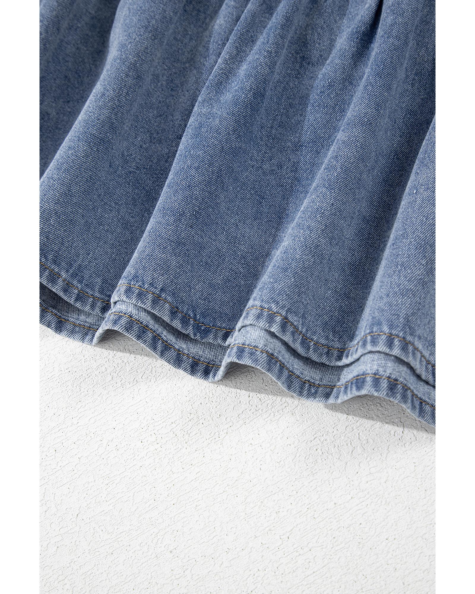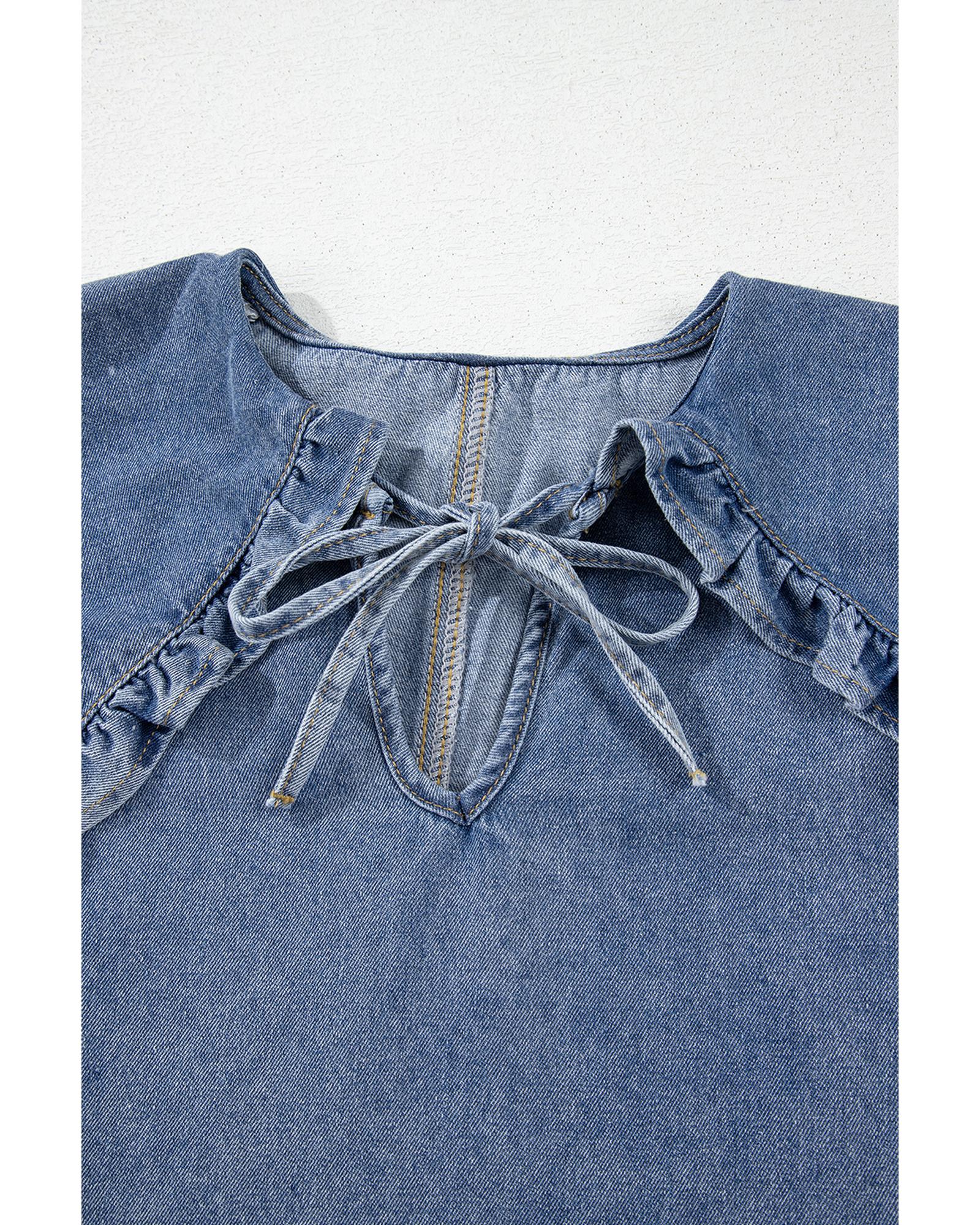 This denim mini dress features a stylish dusk blue color with feminine ruffled detailing and a classic collared neckline. Designed with puff sleeves and convenient side pockets, it offers a trendy and comfortable fit suitable for various occasions.