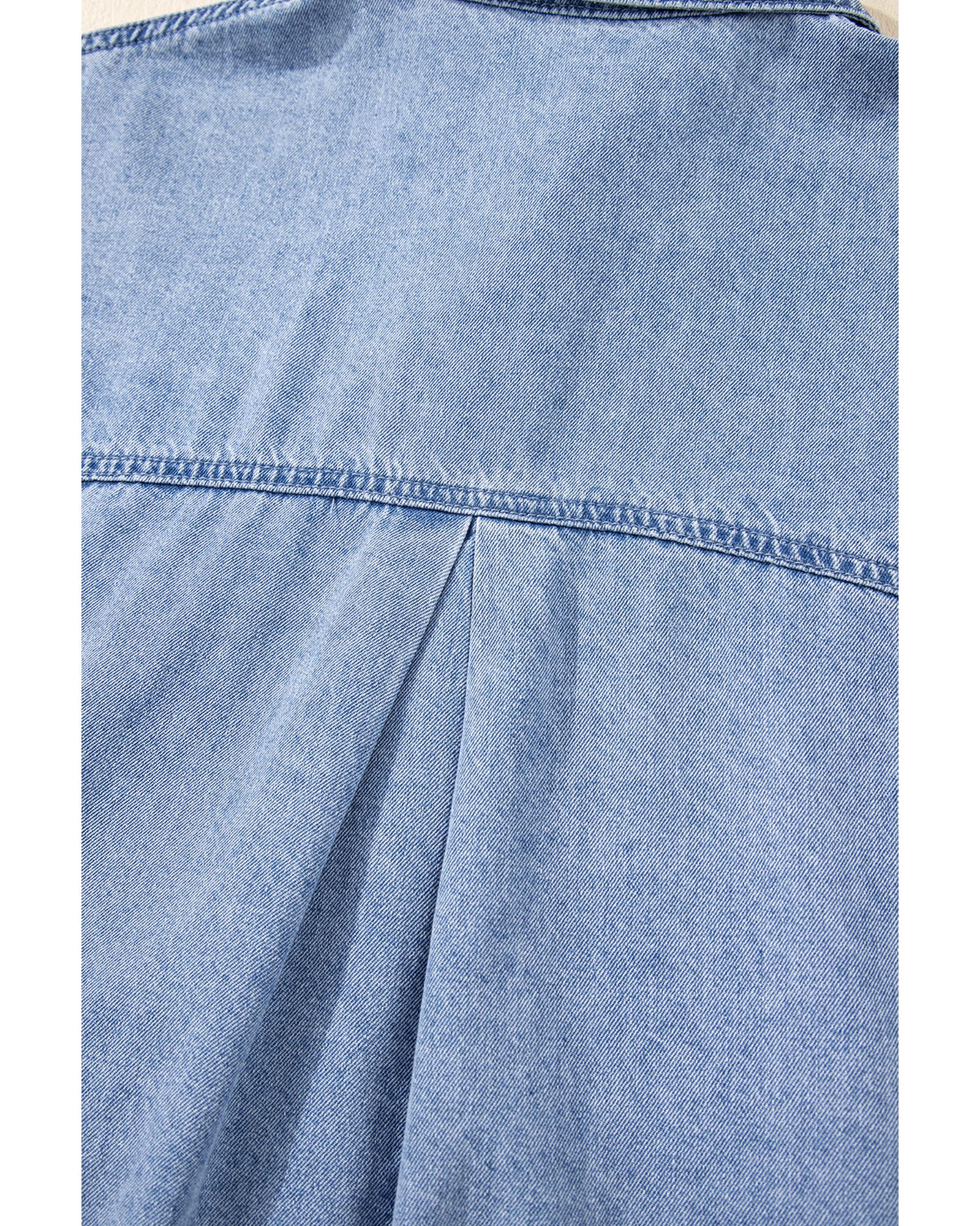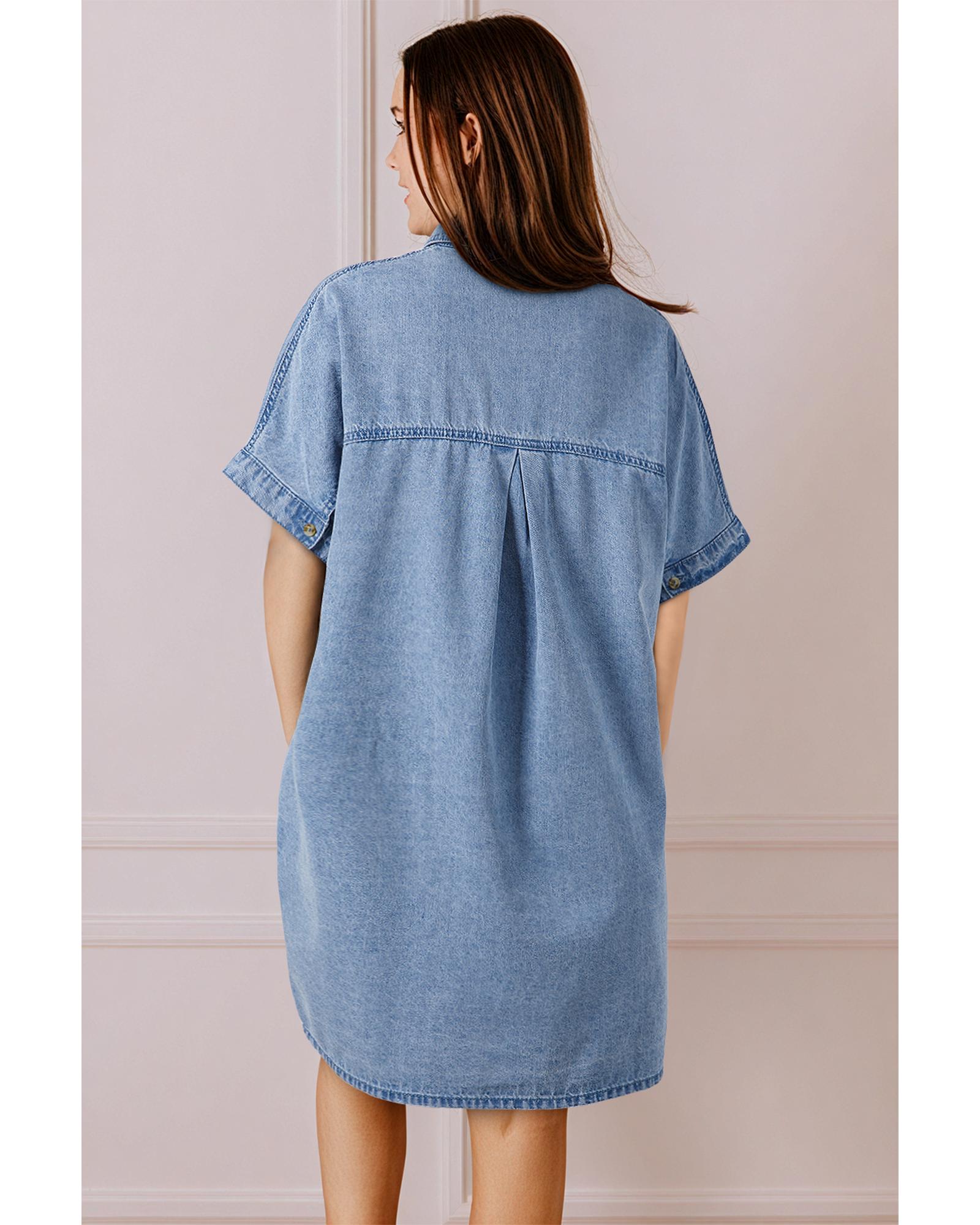 This denim tunic dress features a stylish and sophisticated design with a buttoned front and short sleeves, making it suitable for casual and confident looks. The dress is crafted from a comfortable denim fabric and includes convenient side pockets for practicality.