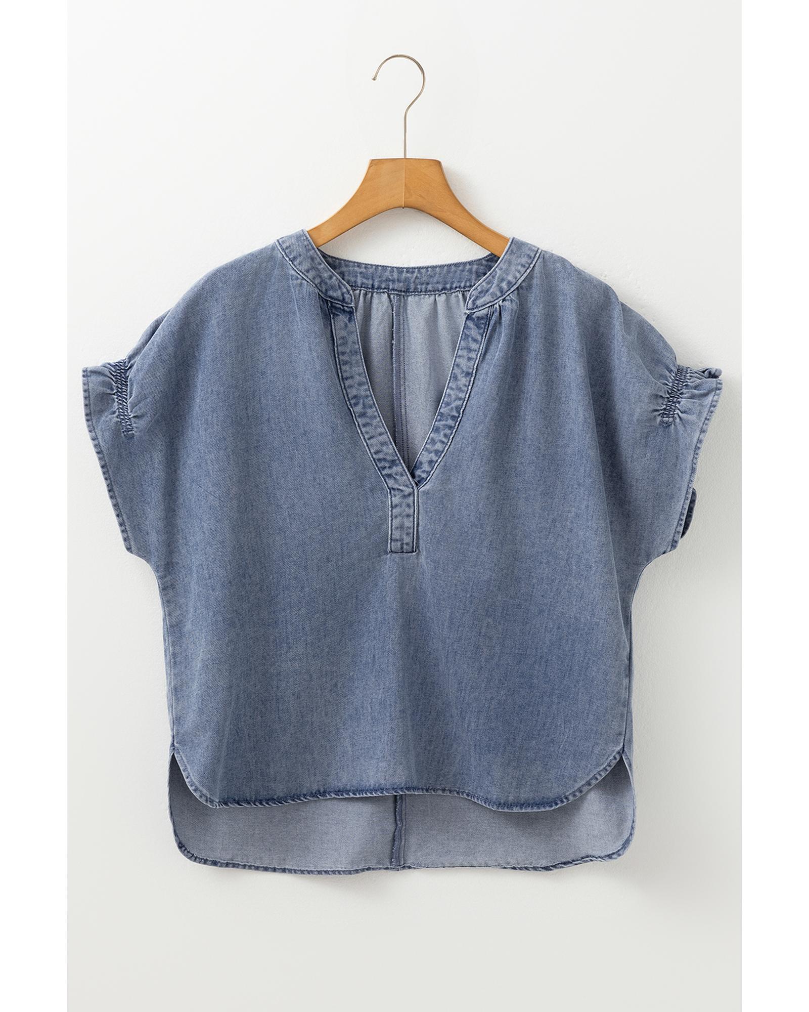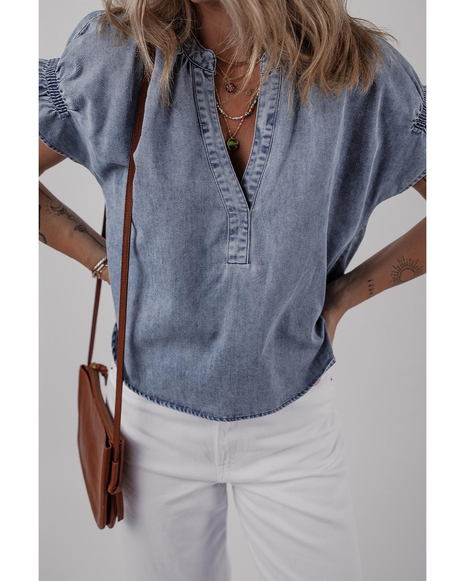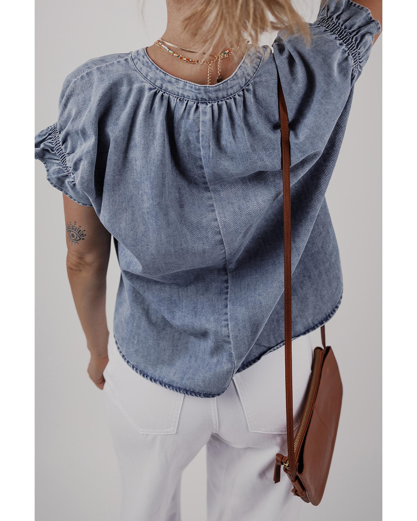This stylish denim top features a soft and comfortable cotton blend material, making it perfect for casual wear. Its elegant V-neck design and delicate ruffled detailing add a touch of femininity. The short puff sleeves enhance the trendy and fashionable look, suitable for various occasions.
