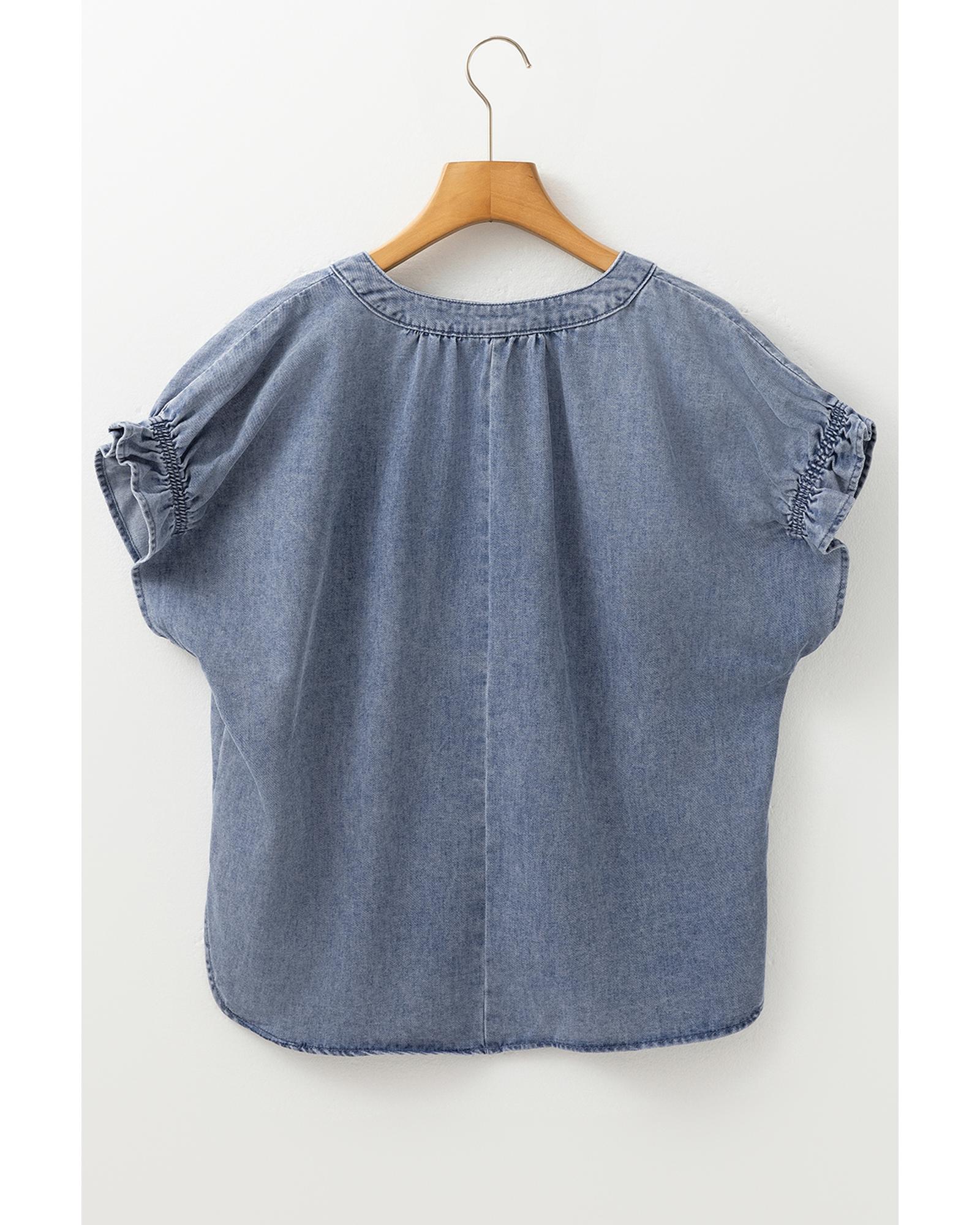 Dusk Blue V Neck Ruffled Short Puff Sleeve Denim Top – L