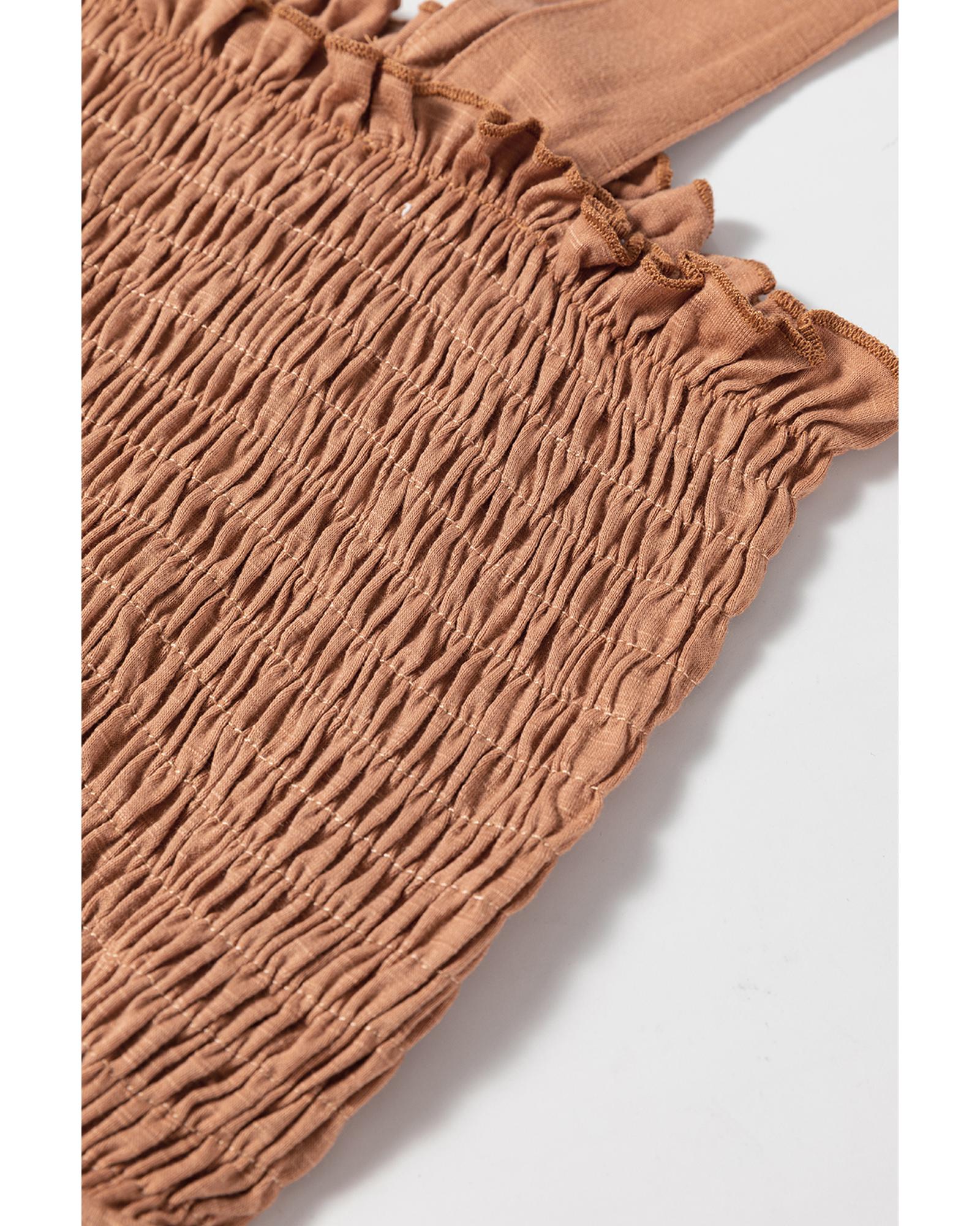 This stylish sleeveless jumpsuit features a dusty pink color with ruffled details and a shirred bodice, creating a feminine and flattering silhouette. The wide-leg pants and flare style offer a trendy and comfortable fit, perfect for various occasions. Thin straps and a ruffled neckline add a flirty and charming touch, making it an ideal choice for a bohemian or casual look.
