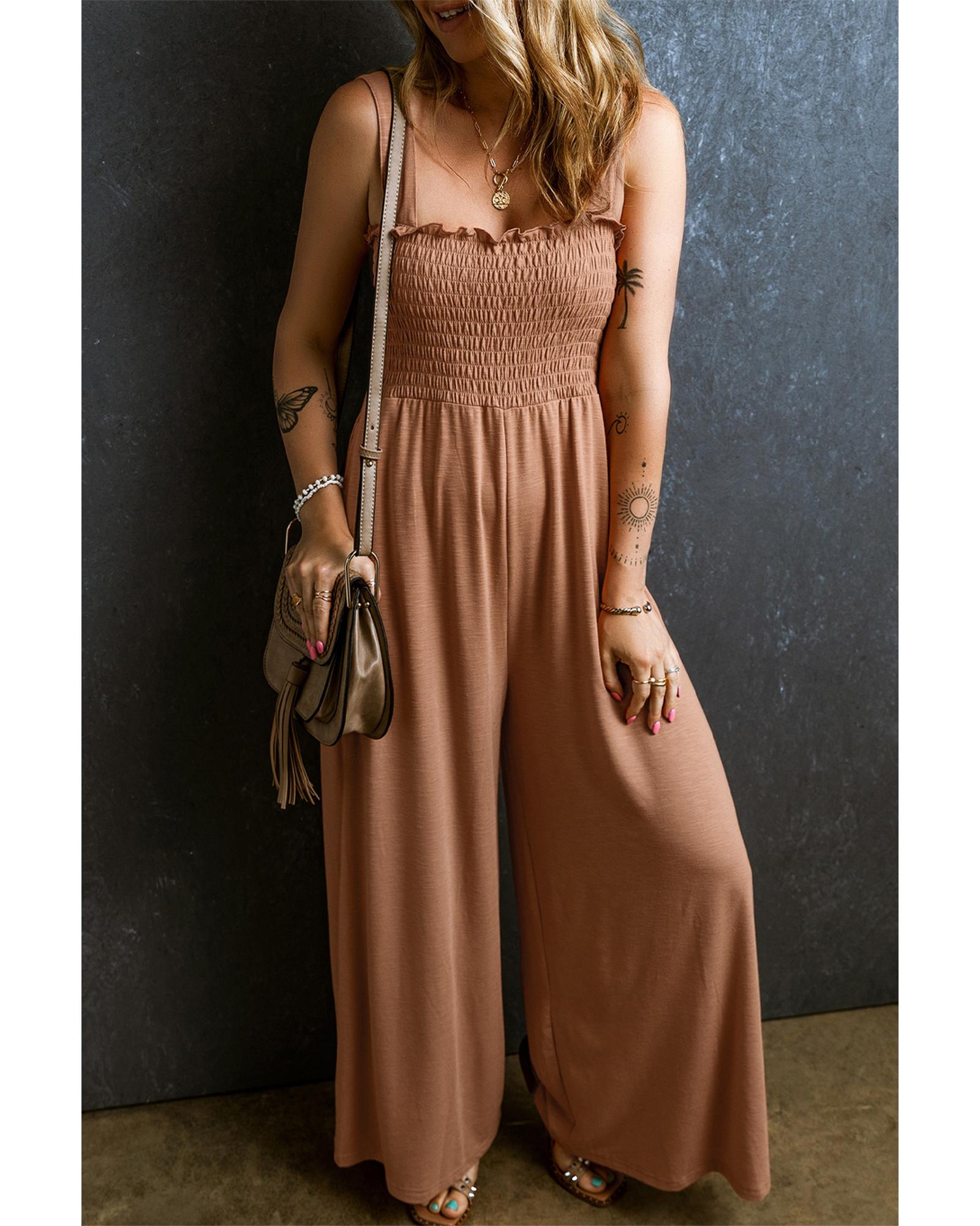 This stylish dusty pink jumpsuit features a ruffled neckline, shirred bodice, and wide-leg pants, creating a feminine and trendy silhouette. The sleeveless design with thin straps offers a flirty look, making it suitable for various occasions and versatile wardrobe options.