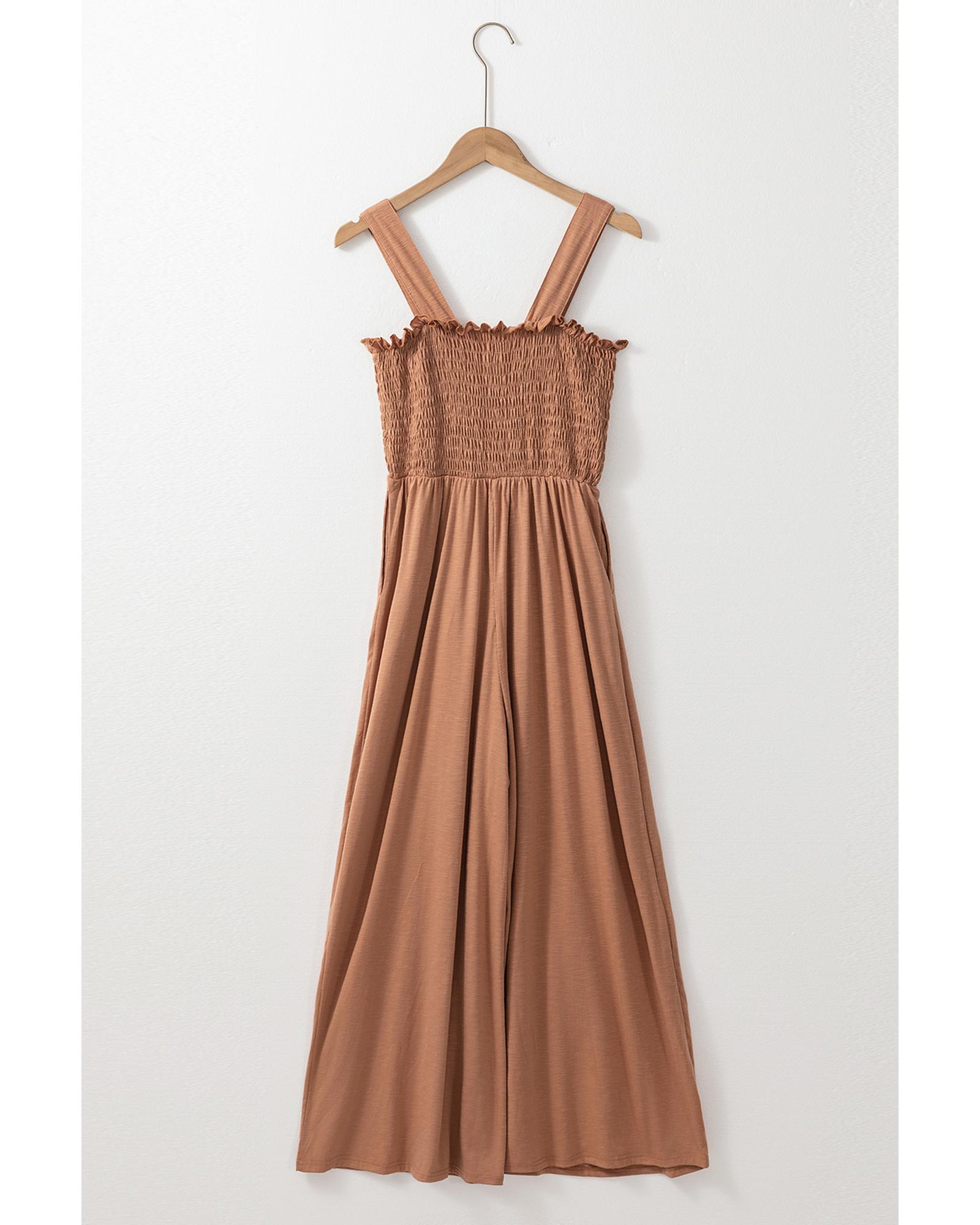 This stylish sleeveless jumpsuit features a dusty pink color with ruffled details and a shirred bodice, designed to create a flattering and feminine silhouette. Its wide-leg, flare style pants offer a comfortable fit, making it a versatile addition to any wardrobe. The thin straps and ruffled neckline add a flirty and charming touch, perfect for casual outings or bohemian-inspired looks.