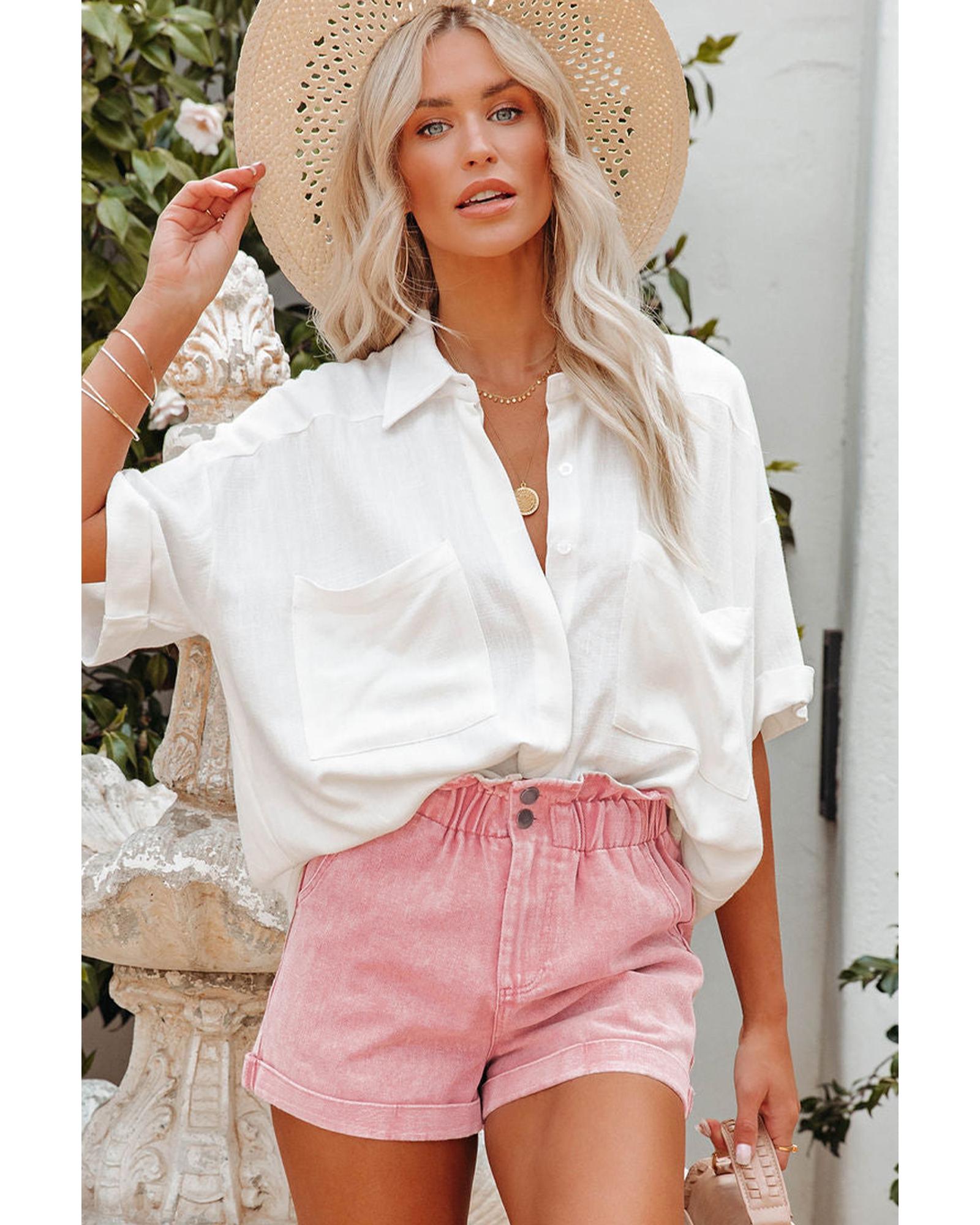 This vintage washed denim shorts feature a stylish frilled high waist design with a trendy fitted look. They are suitable for women and modern girls of various ages, offering a fashionable and comfortable option for casual wear.