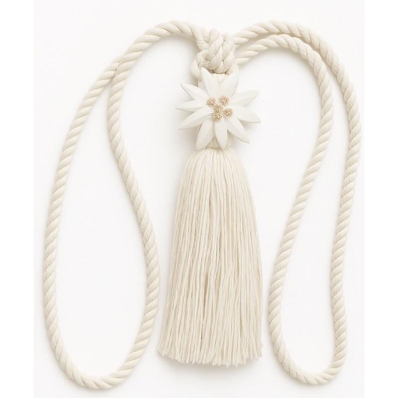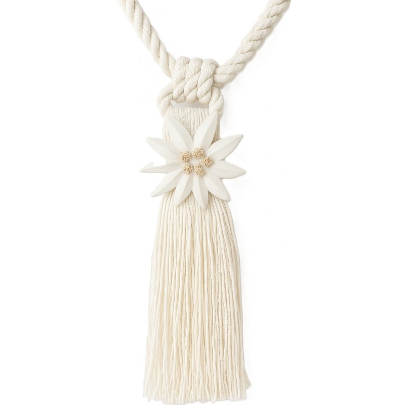 This tieback is a beautifully crafted decorative accessory designed to enhance the appearance of curtains. It combines elegant materials and intricate details to add a touch of sophistication to any room. The design features a twisted rope and flowing tassel, with a central decorative element that resembles a flower, creating a refined and stylish look.