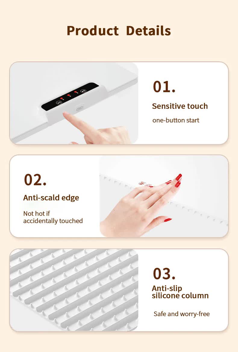 This electric food warmer heating plate features a large surface area designed to keep multiple dishes warm simultaneously. It is suitable for use at family gatherings, parties, or buffets, providing a practical solution for serving hot food. The adjustable temperature control allows for precise warming to accommodate different types of food. Its sleek and easy-to-clean design makes it a functional addition to any kitchen or dining space.