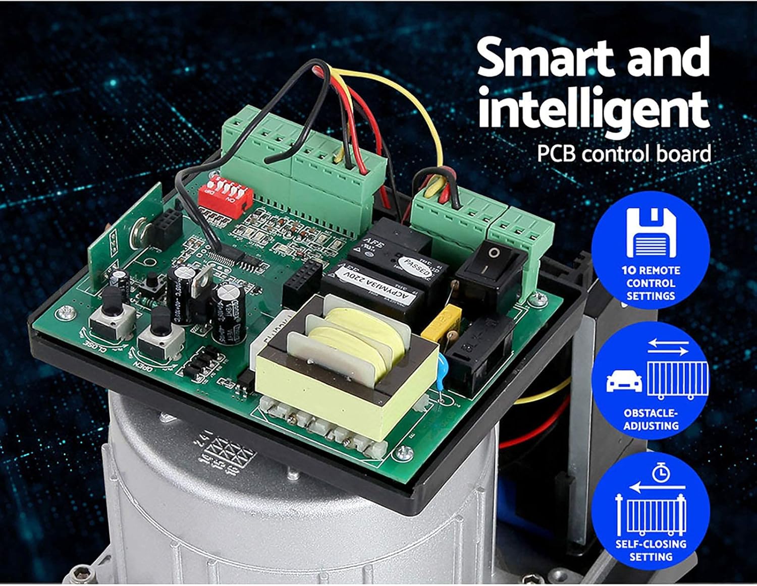 - Safety features: emergency release, obstruction sensitivity, auto-reverse