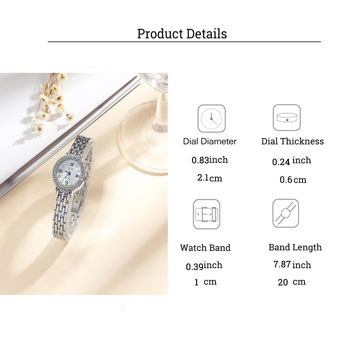 - Complete 5-piece set including a watch, necklace, bracelet, ring, and earrings
