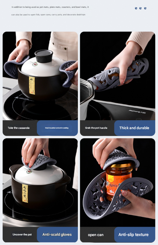 This set of three floral silicone trivet mats combines elegant design with practical functionality. Made from high-quality, food-grade silicone, these mats are heat resistant, non-slip, and versatile for various kitchen tasks. Their intricate hollow patterns add aesthetic appeal while aiding in heat dissipation and surface protection.