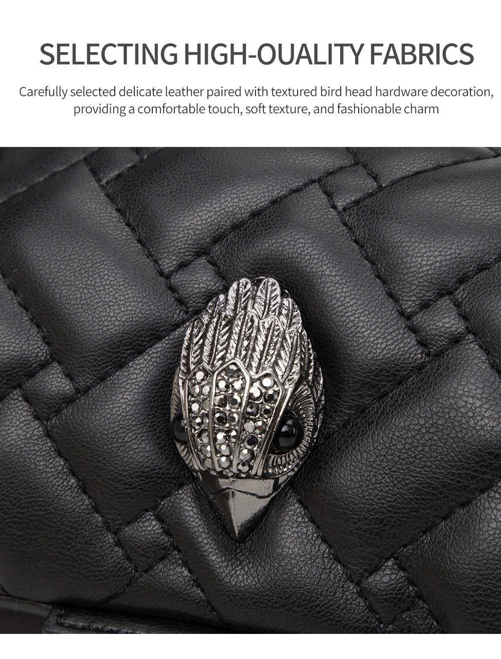 This elegant quilted leather chain bag features a sophisticated design with a distinctive bird head clasp, making it suitable for various occasions. Crafted from high-quality materials, it combines style and practicality with a spacious interior and organized compartments.
