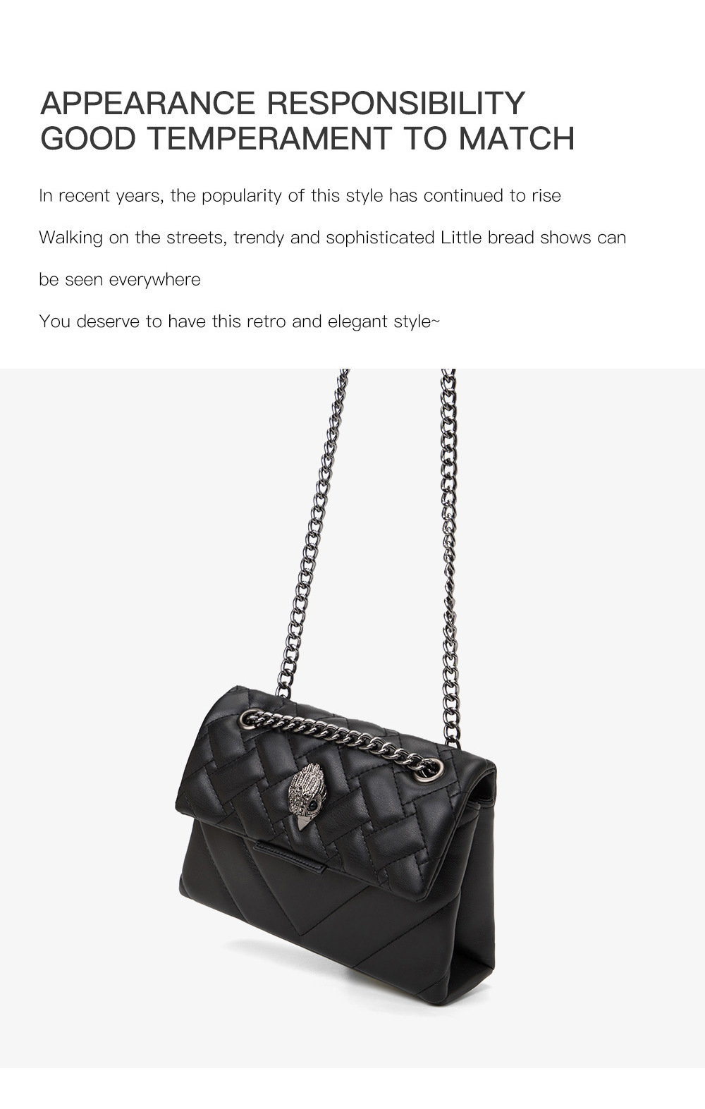 This elegant quilted leather chain bag features a sophisticated design with a distinctive bird head clasp, making it a stylish accessory suitable for various occasions. Crafted from high-quality materials, it combines a retro aesthetic with modern functionality, offering a versatile option for daily use or special events.